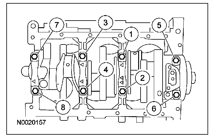 Crankshaft main bearing cap bolts Tighten bolts in pairs to 80 Nm (59 ft. lbs).