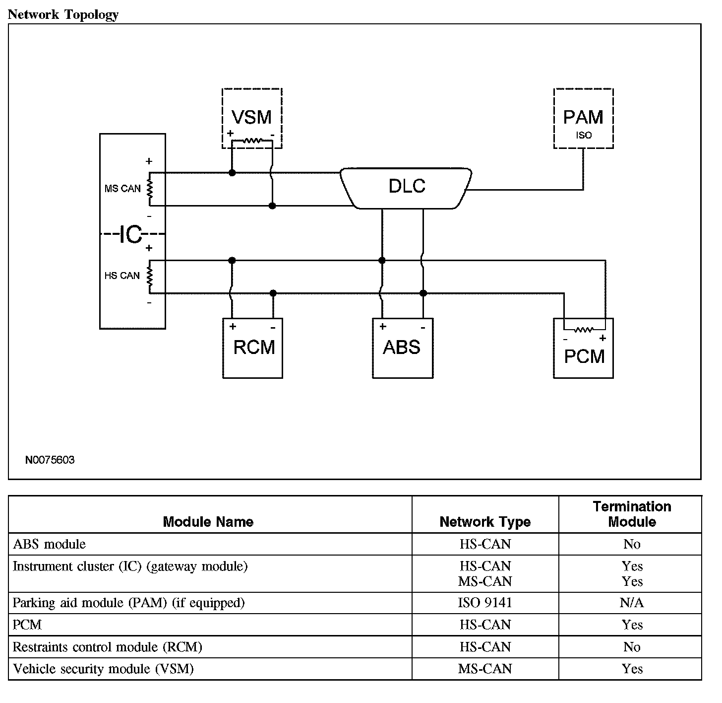 The instrument cluster (IC) is the gateway module, translating HS-CAN to MS-CAN and vice versa. This information allows a message to be distributed throughout both networks. The IC is the only module on this vehicle that has this ability.