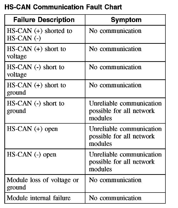 The following fault chart describes the specific HS-CAN failures and their resulting symptom: