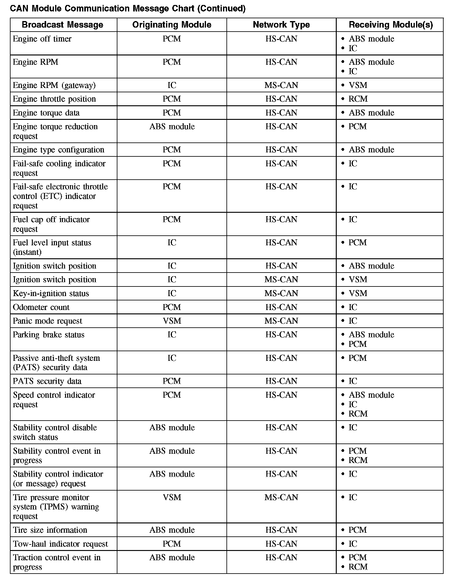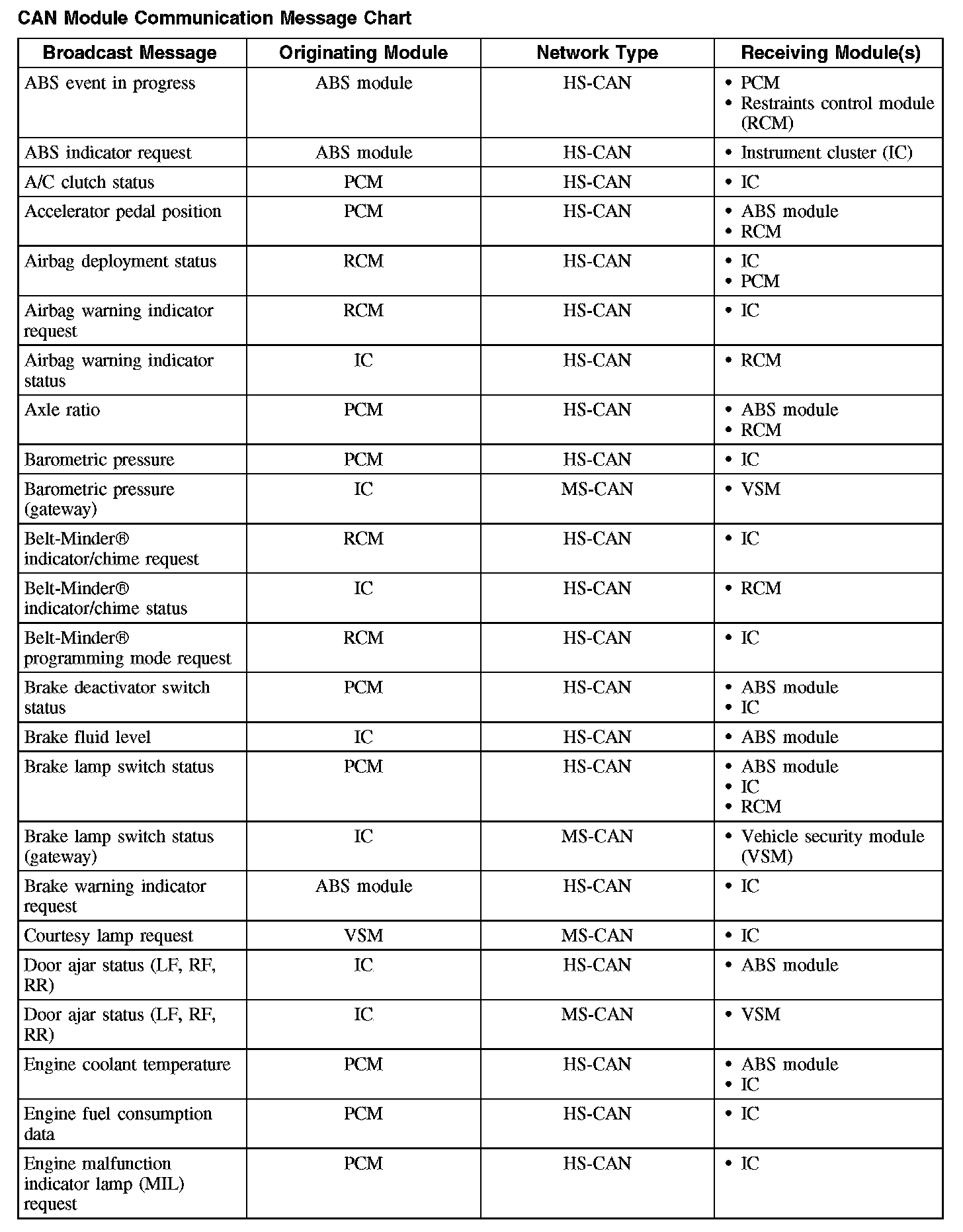 The following chart describes the specific CAN messages broadcast by each module, and the module(s) that receive the message: