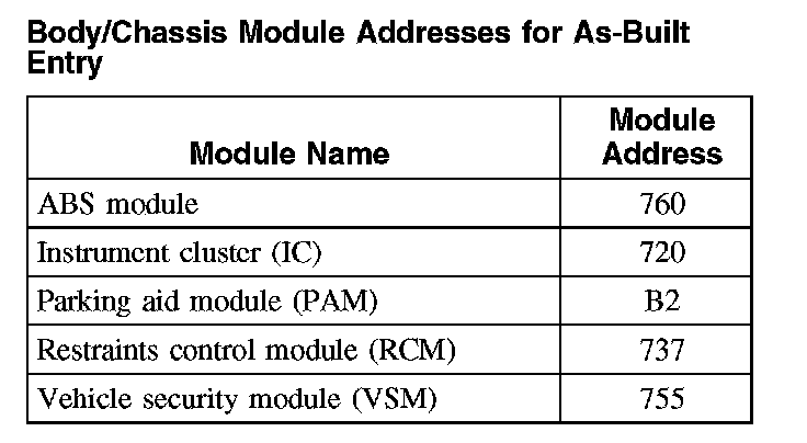 Body/Chassis Module Addresses for As-Built Entry: