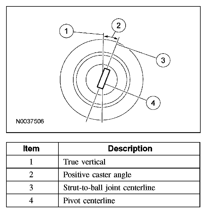 Caster is the deviation from vertical of an imaginary line drawn through the ball joints when viewed from the side. The caster specifications will give the vehicle the best directional stability characteristics when loaded and driven. The caster setting is not related to tire wear.