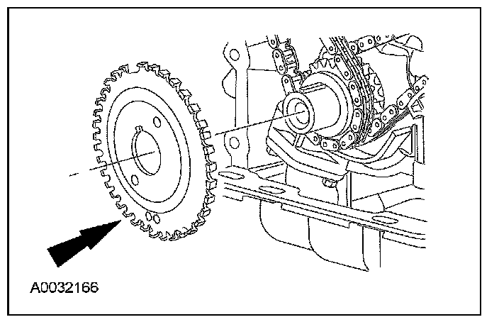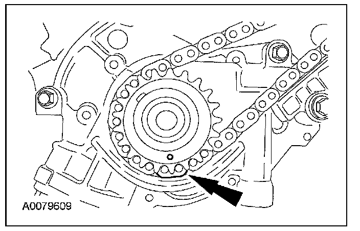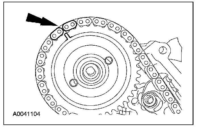 Position the timing chain on the camshaft sprocket with the camshaft sprocket timing mark positioned between the 2 copper (marked) chain links.