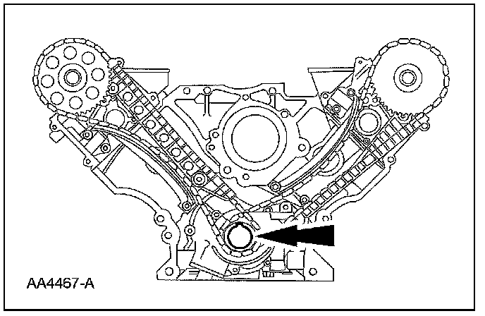 11. NOTE: The LH timing chain tensioner arm has a bump near the dowel hole for identification.