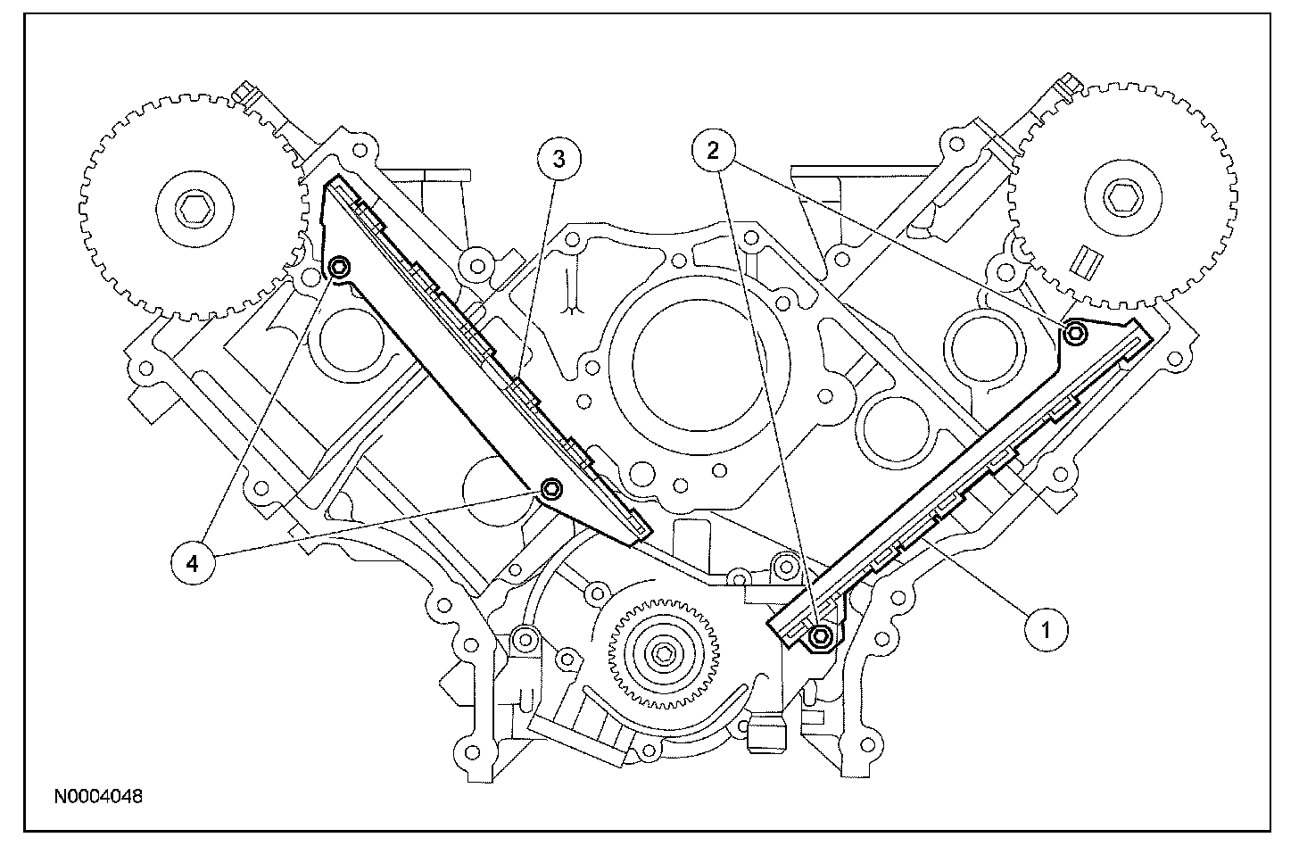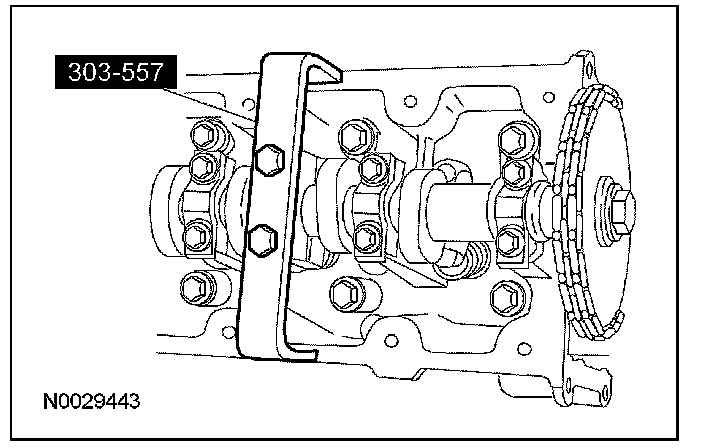 3. CAUTION: Unless otherwise instructed, at no time when the timing chains are removed and the cylinder heads are installed is the crankshaft or camshaft to be rotated. Severe piston and valve damage will occur.