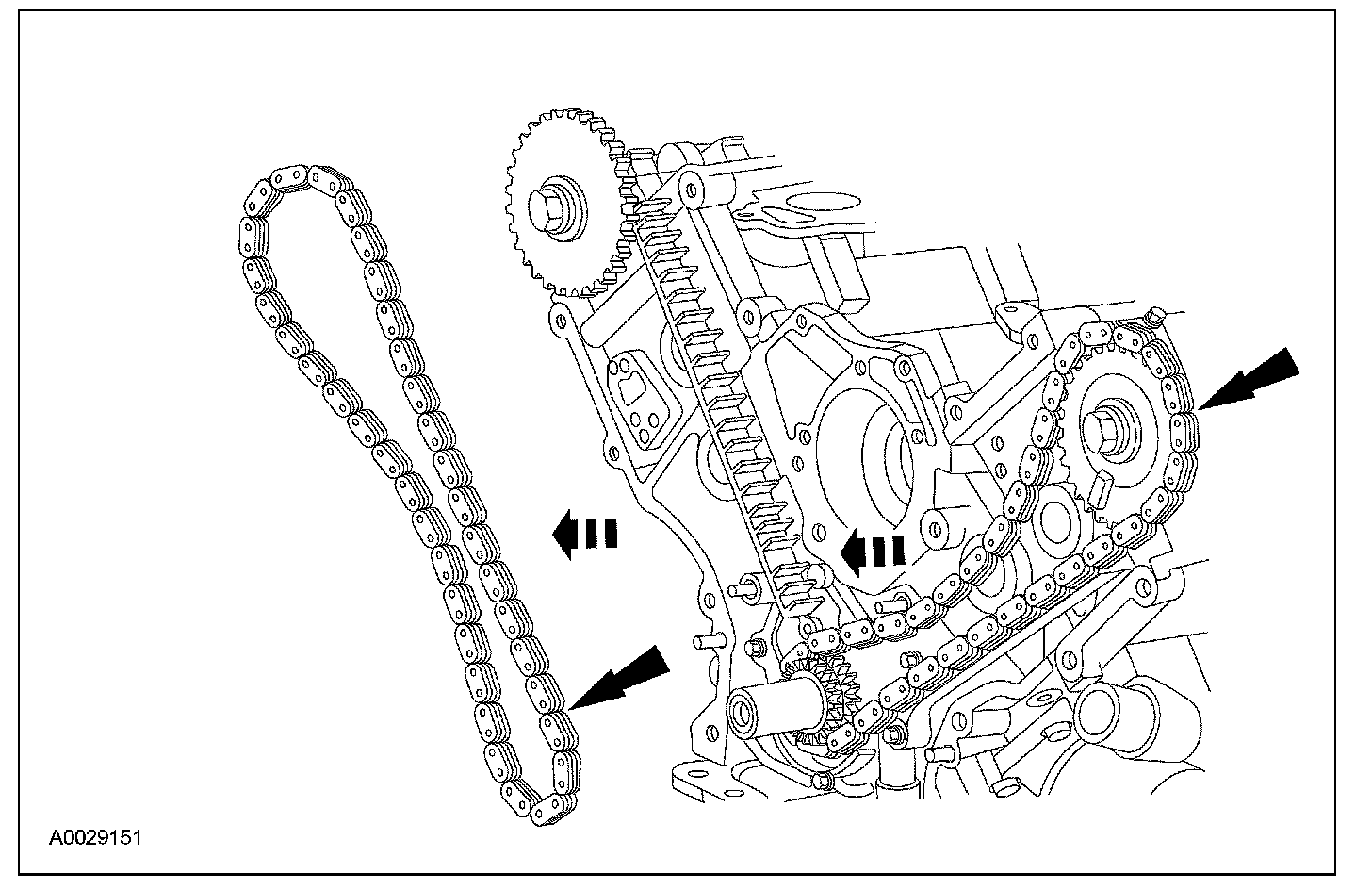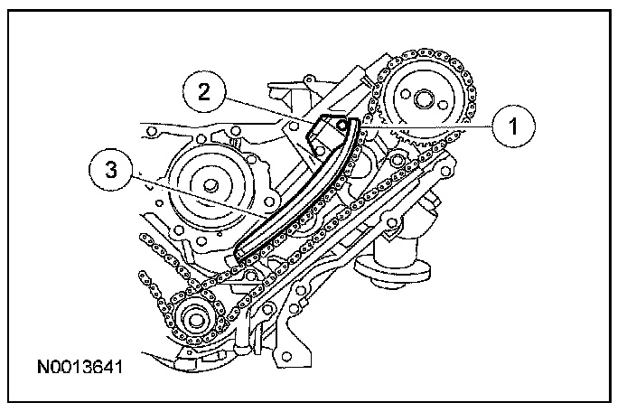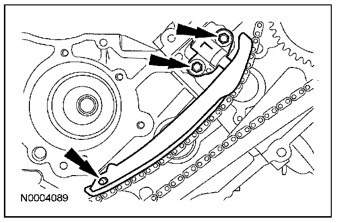 13. NOTE: The lower half of the timing chain must be positioned above the tensioner arm dowel.