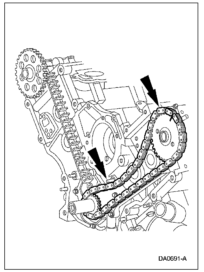 Position the lower end of the RH (outer) timing chain on the crankshaft sprocket, aligning the timing mark on the sprocket with the single copper (marked) link on the timing chain.