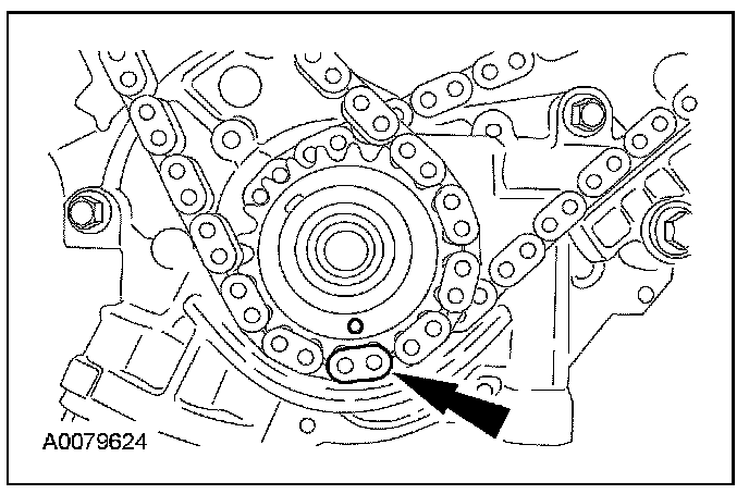 9. Position the lower end of the LH (inner) timing chain on the crankshaft sprocket, aligning the timing mark on the outer flange of the crankshaft sprocket with the single copper (marked) link on the chain.