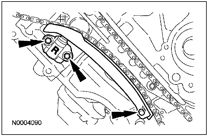 15. Position the RH timing chain tensioner arm on the dowel pin and install the RH timing chain tensioner.