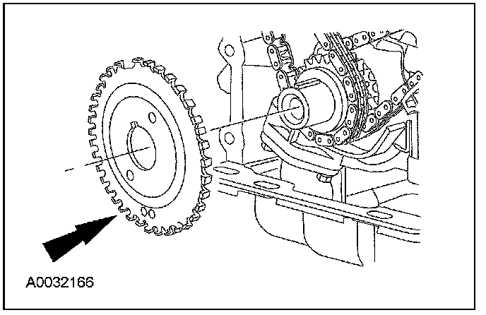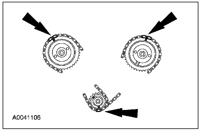 Position the RH timing chain on the camshaft sprocket. Make sure the camshaft sprocket timing mark is positioned between the 2 copper (marked) chain links.