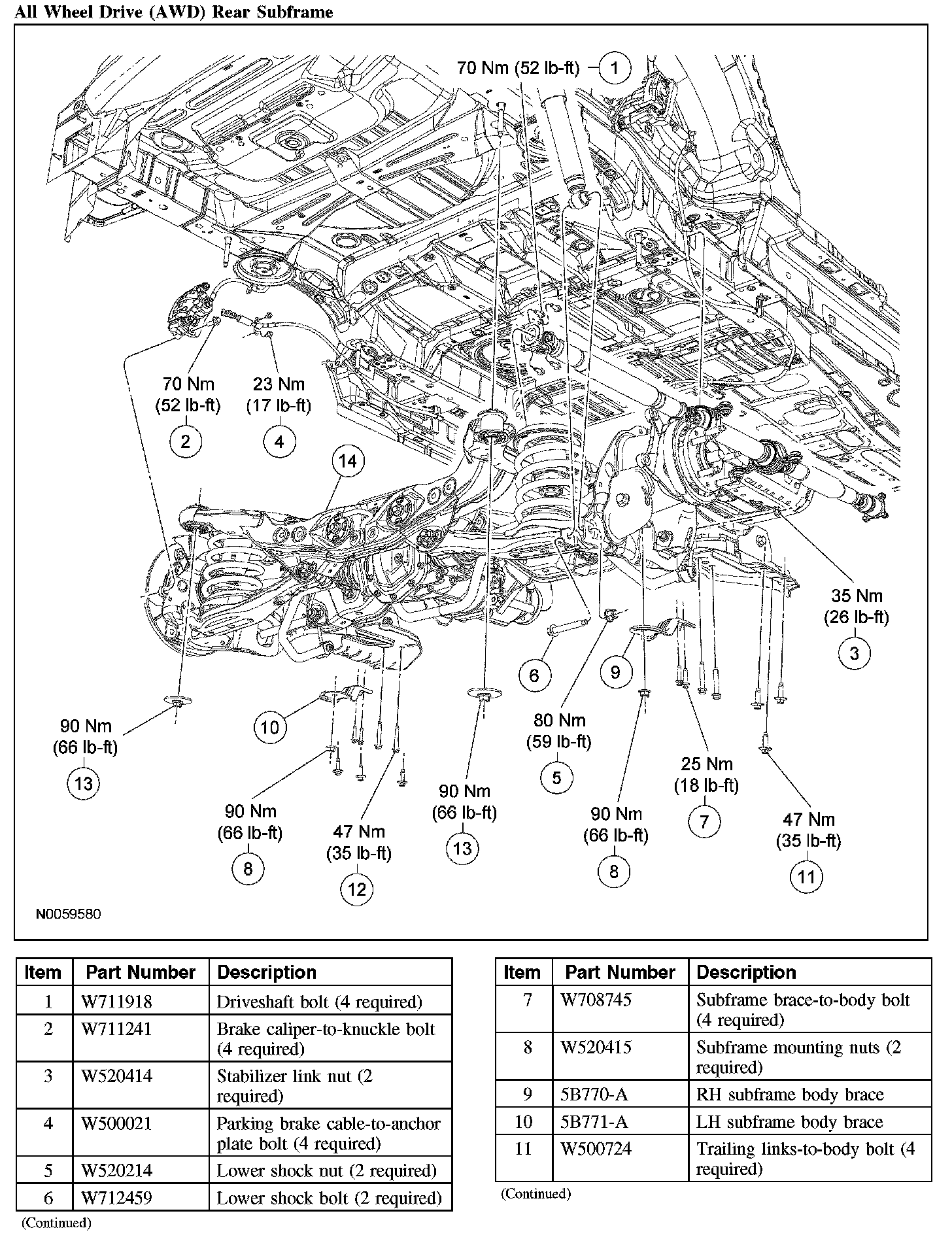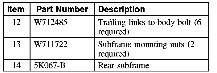 CAUTION: Suspension and subframe fasteners are critical parts because they affect performance of vital parts and systems and their failure may result in major service expense. A new part with the same part number must be installed if installation becomes necessary. Do not use a replacement part of lesser quality or substitute design. Torque values must be used as specified during reassembly to make sure of correct retention of these parts.