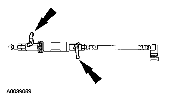 5. Install the dye/lubricant injector between the low-side service gauge port valve and the refrigerant service station or manifold gauge set.