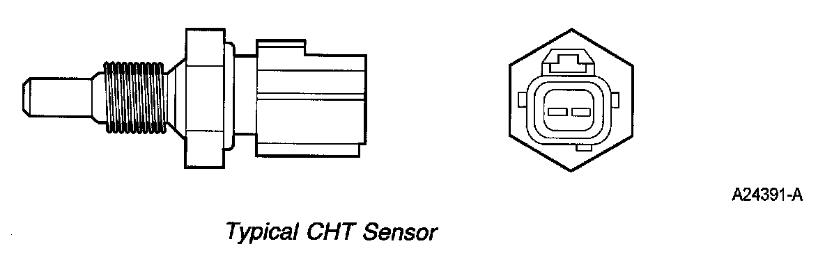 The CHT sensor is a thermistor device in which resistance changes with the temperature. The electrical resistance of a thermistor decreases as temperature increases, and the resistance increases as the temperature decreases. The varying resistance affects the voltage drop across the sensor terminals and provides electrical signals to the PCM corresponding to temperature.