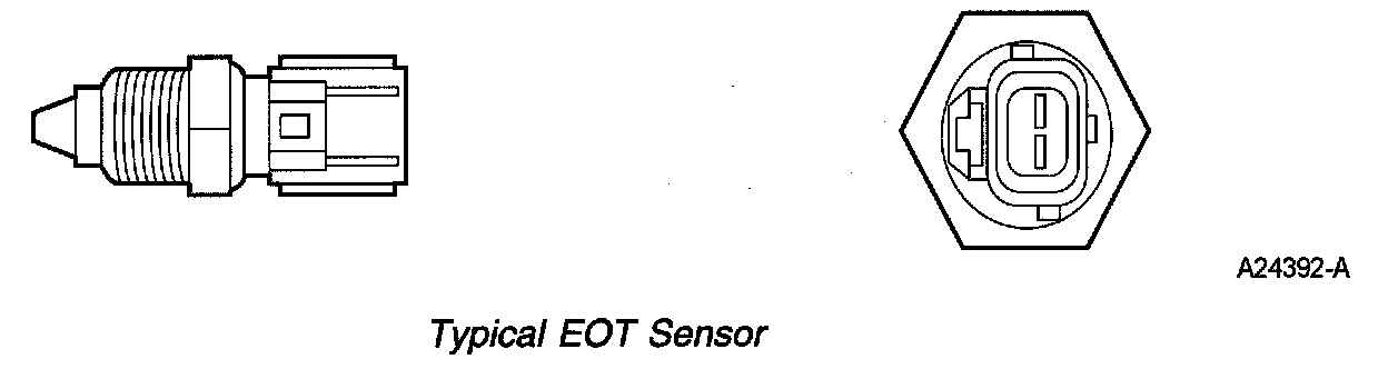 The EOT sensor is a thermistor device in which resistance changes with temperature. The electrical resistance of a thermistor decreases as the temperature increases and the resistance increases as the temperature decreases. The varying resistance changes the voltage drop across the sensor terminals and provides electrical signals to the PCM corresponding to temperature.
