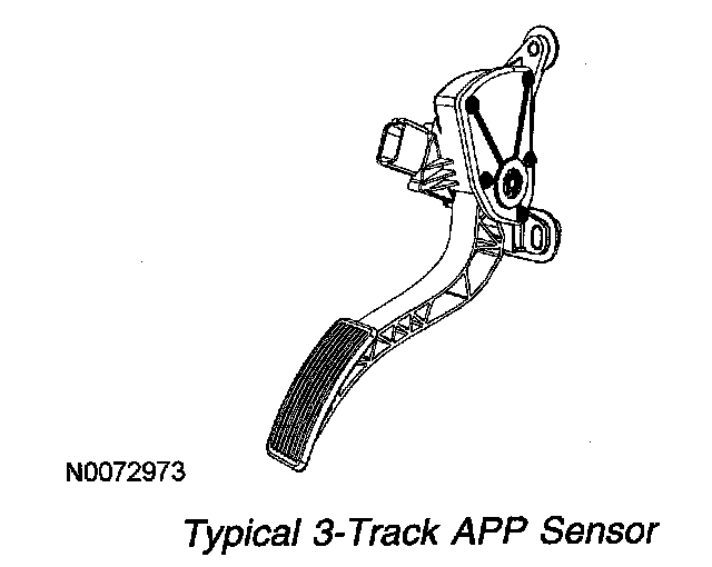 The APP sensor is an input to the powertrain control module (PCM) and is used to determine the amount of torque requested by the operator. Depending on the application either a 2-track or 3-track APP sensor is used.