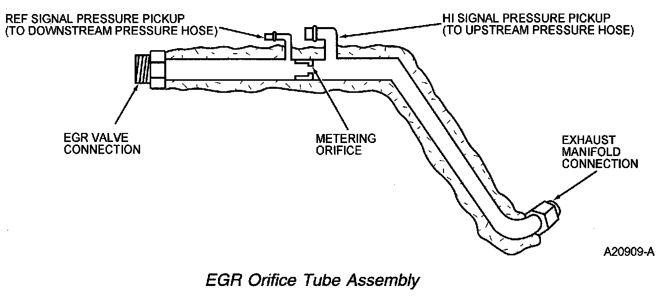 The orifice tube assembly is a section of tubing connecting the exhaust system to the intake manifold. The assembly provides the flow path for the EGR to the intake manifold and also contains the metering orifice and 2 pressure pick-up tubes. The internal metering orifice creates a measurable pressure drop across it as the EGR valve opens and closes. This pressure differential across the orifice is picked up by the differential pressure feedback EGR sensor which provides feedback to the PCM.