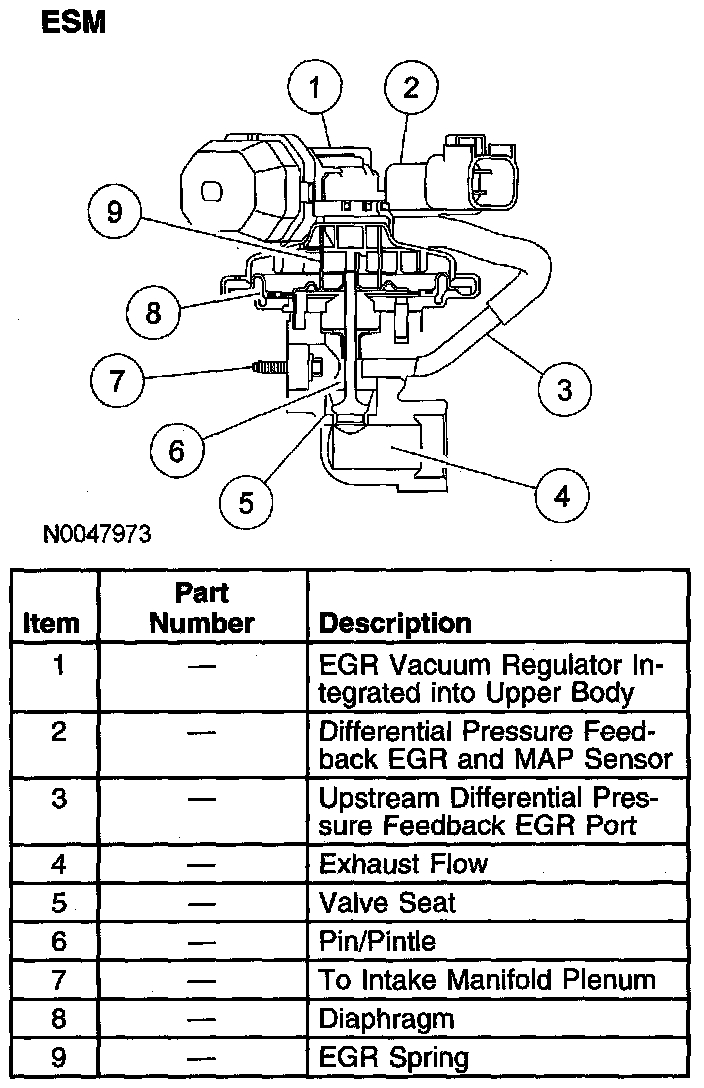 The ESM is an integrated differential pressure feedback EGR system that functions in the same manner as a conventional differential pressure feedback EGR system. The various system components have been integrated into a single component called the ESM. The flange of the valve portion of the ESM bolts directly to the intake manifold with a metal gasket that forms the metering orifice. This arrangement increases system reliability, response time, and system precision. By relocating the EGR orifice from the exhaust to the intake side of the EGR valve, the downstream pressure signal measures manifold absolute pressure (MAP). This MAP signal is used for EGR correction and inferred barometric pressure (BARO) at key on. The system provides the powertrain control module (PCM) with a differential pressure feedback EGR signal, identical to a traditional differential pressure feedback EGR system.
