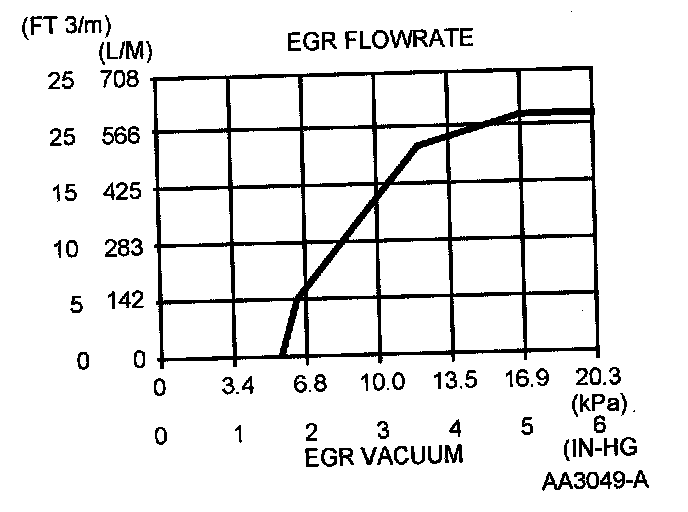The EGR valve in the differential pressure feedback EGR system is a conventional, vacuum-actuated. The valve increases or decreases the flow of EGR. As vacuum applied to the EGR valve diaphragm overcomes the spring force, the valve begins to open. As the vacuum signal weakens, at 5.4 kPa (1.6 in-Hg) or less, the spring force closes the valve. The EGR valve is fully open at about 15 kPa (4.5 in-Hg).