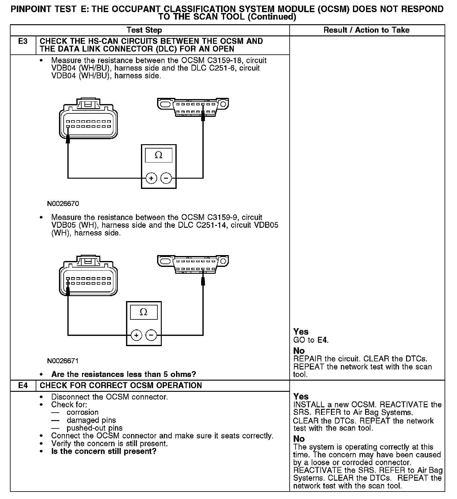 PINPOINT TEST E: THE OCCUPANT CLASSIFICATION SYSTEM MODULE (OCSM) DOES NOT RESPOND TO THE SCAN TOOL