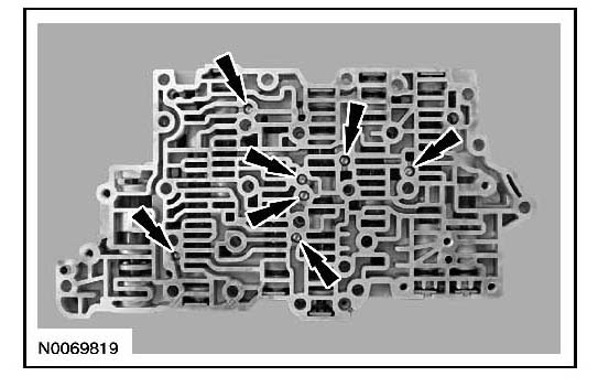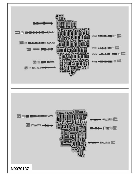 CAUTION: Remove the valves by tapping the valve body on the palm of the hand to slide the valves out of the bores. It may be necessary to remove the valves and springs using a pick. If it is necessary to use a pick, use extreme caution to prevent damaging the valves or valve bores. If necessary, disassemble parts of the main control valve body in small groups. Take special care when handling the main control components, since they are the most precise and delicate parts of the transaxle. Neatly arrange the parts as they are removed to avoid mixing similar pieces.