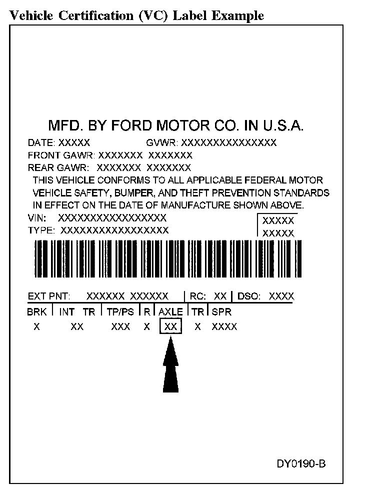The vehicle certification (VC) label is located in the driver door jamb. The axle code is on the VC label. Refer to Vehicle/Application and ID.