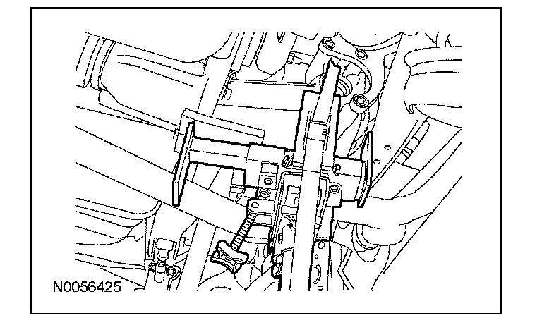 4. Position a suitable transmission hydraulic jack to the axle housing. Securely strap the jack to the housing.