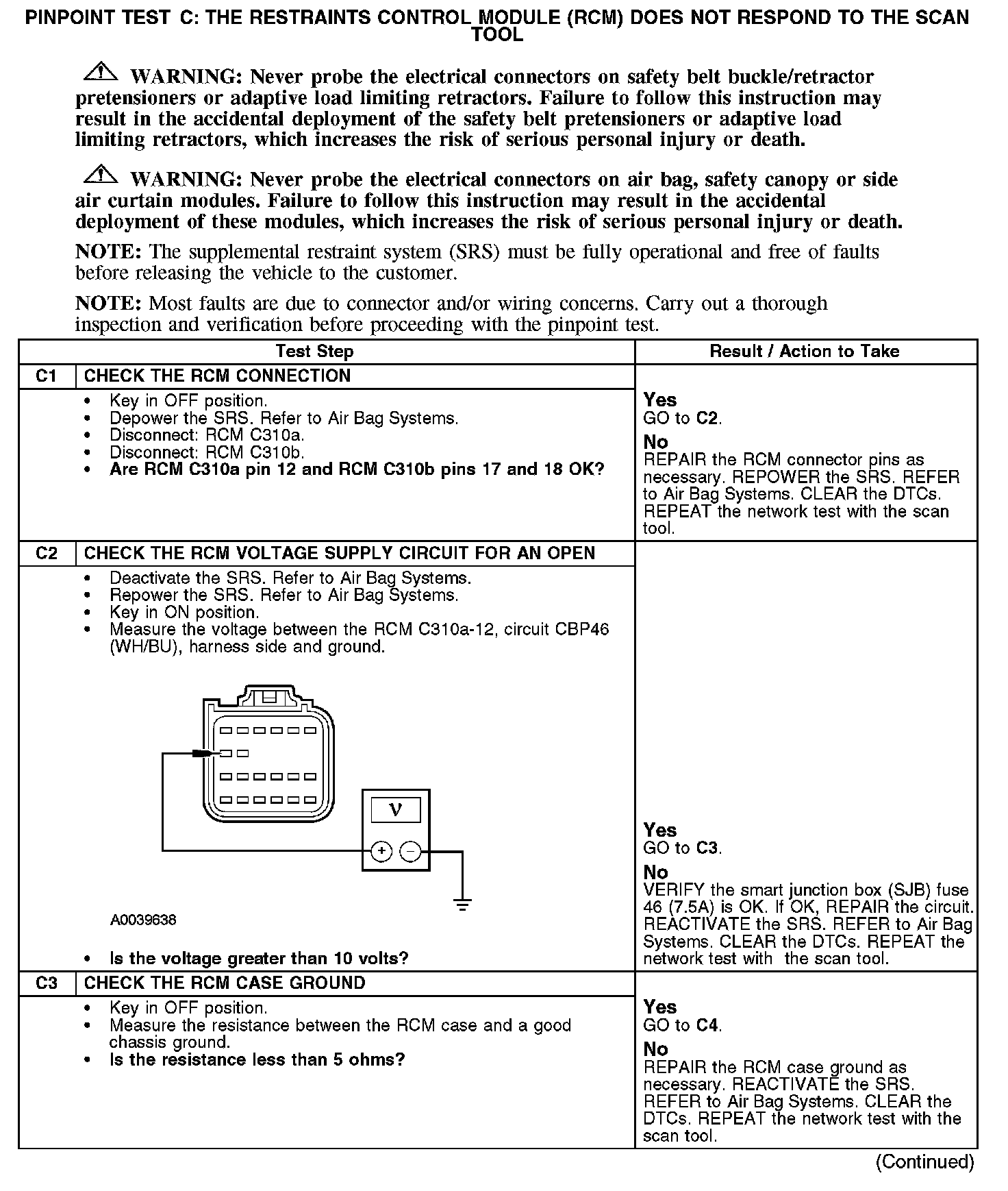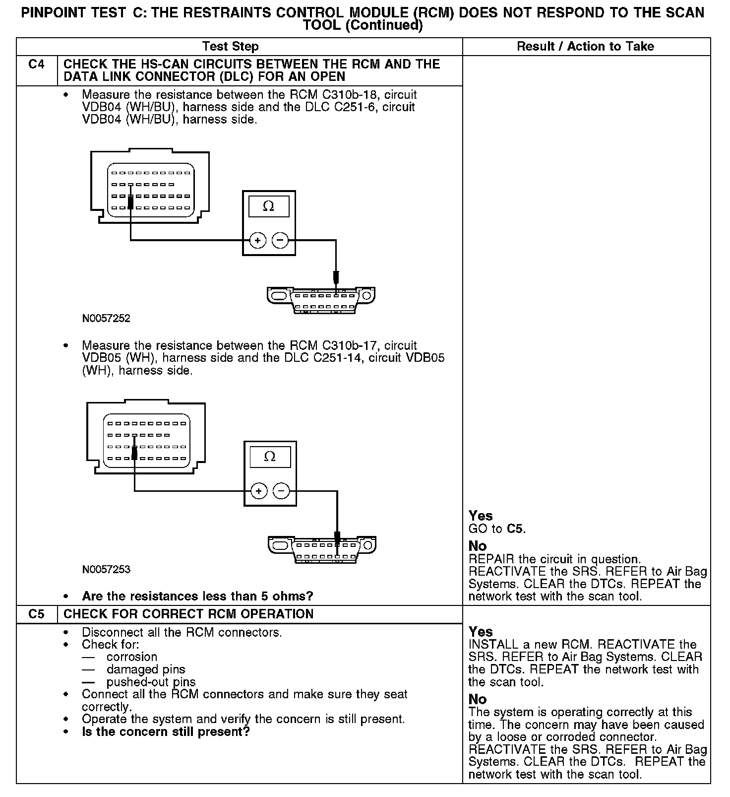 Home >> Ford >> 2008 >> Edge FWD V6-3.5L >> Repair and Diagnosis >> Powertrain Management >> Computers and Control Systems >> Information Bus >> Testing and Inspection >> Pinpoint Tests >> Test C: The Restraints Control Module (RCM) Does Not Respond To The Scan Tool