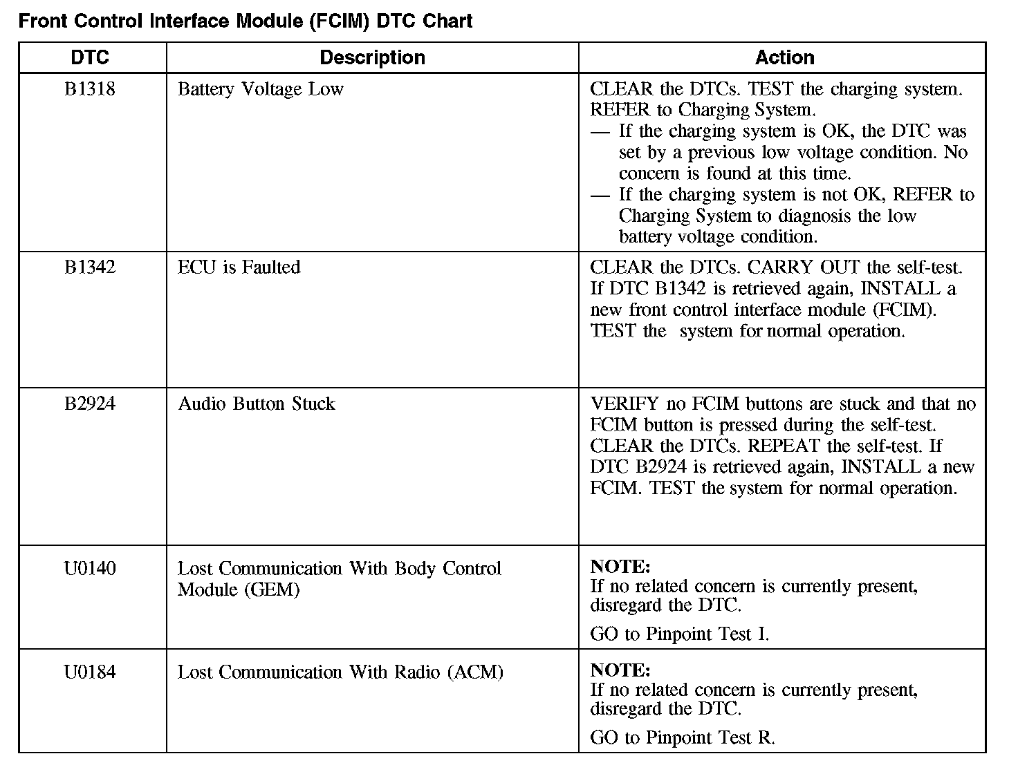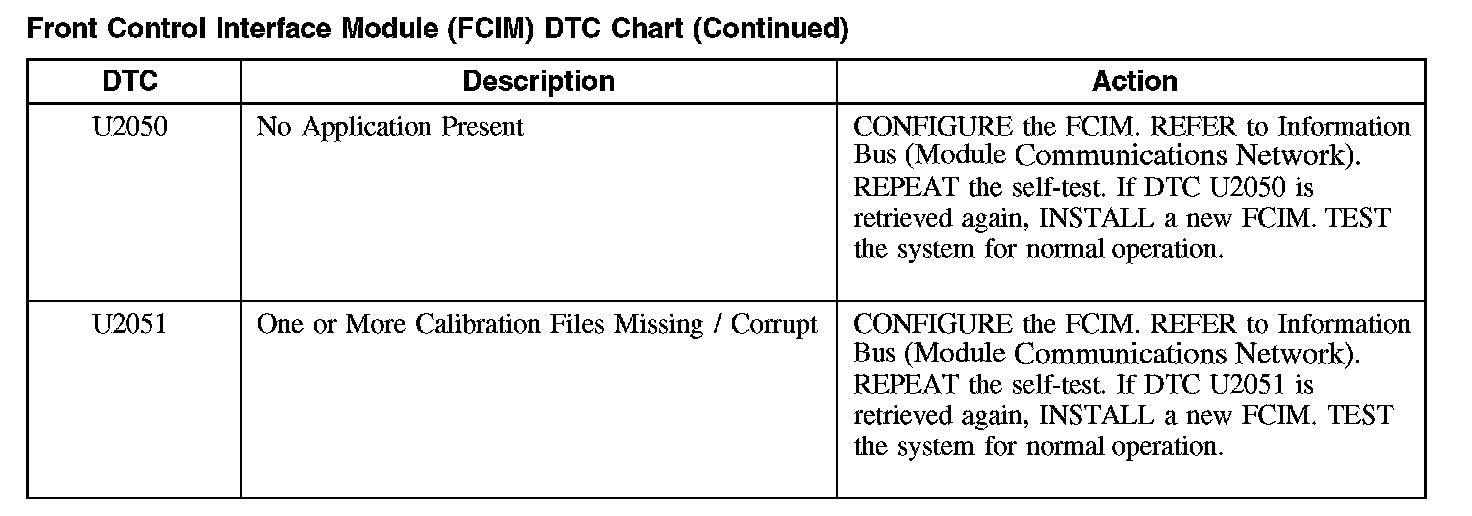 Front Control Interface Module (FCIM) DTC Chart