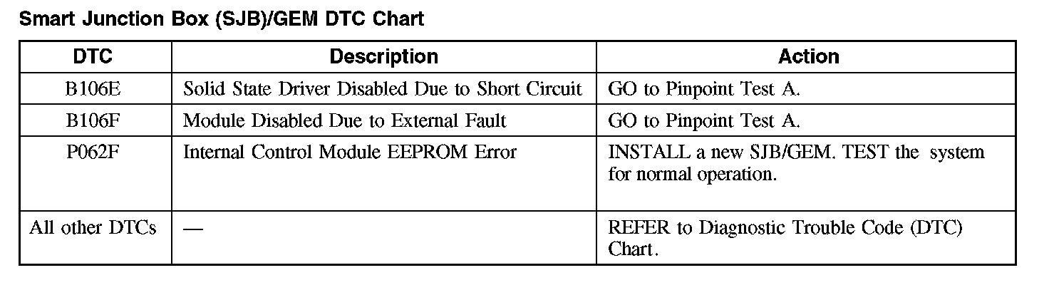 Smart Junction Box (SJB)/GEM DTC Chart