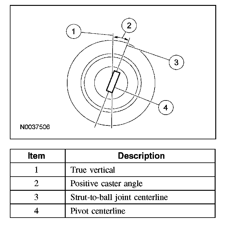 Caster is the deviation from vertical of an imaginary line drawn through the pivot points (top of strut and lower ball joint), when viewed from the side. The caster specifications will give the vehicle the best directional stability characteristics when loaded and driven. The caster setting is not related to tire wear. The caster setting is not adjustable.