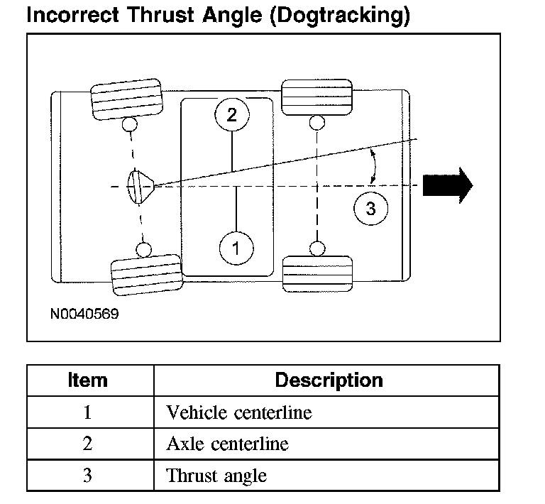 Incorrect thrust angle (also known as dogtracking) is the condition in which the rear axle is not square to the chassis. Heavily crowned roads can give the illusion of dogtracking.