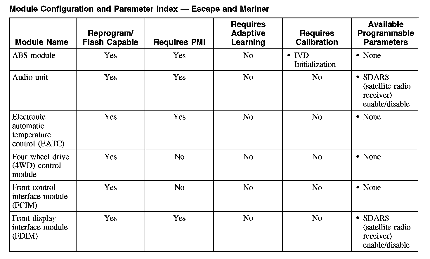 Home >> Ford >> 2008 >> Escape 2WD V6-3.0L >> Repair and Diagnosis >> Powertrain Management >> Computers and Control Systems >> Information Bus >> Testing and Inspection >> Initial Inspection and Diagnostic Overview >> Module Configuration >> Principles of Operation