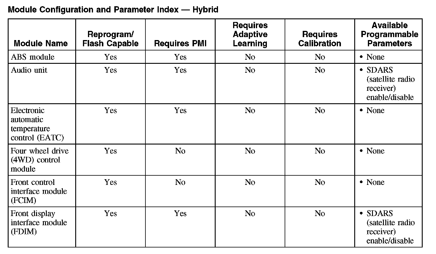 Programmable parameters are customer preference items that may be modified by the dealer via scan tool or in some cases modified by the customer following a procedure listed in the vehicle Owner's Literature. While many configuration options may exist for a module, only a few of these options are programmable parameters.