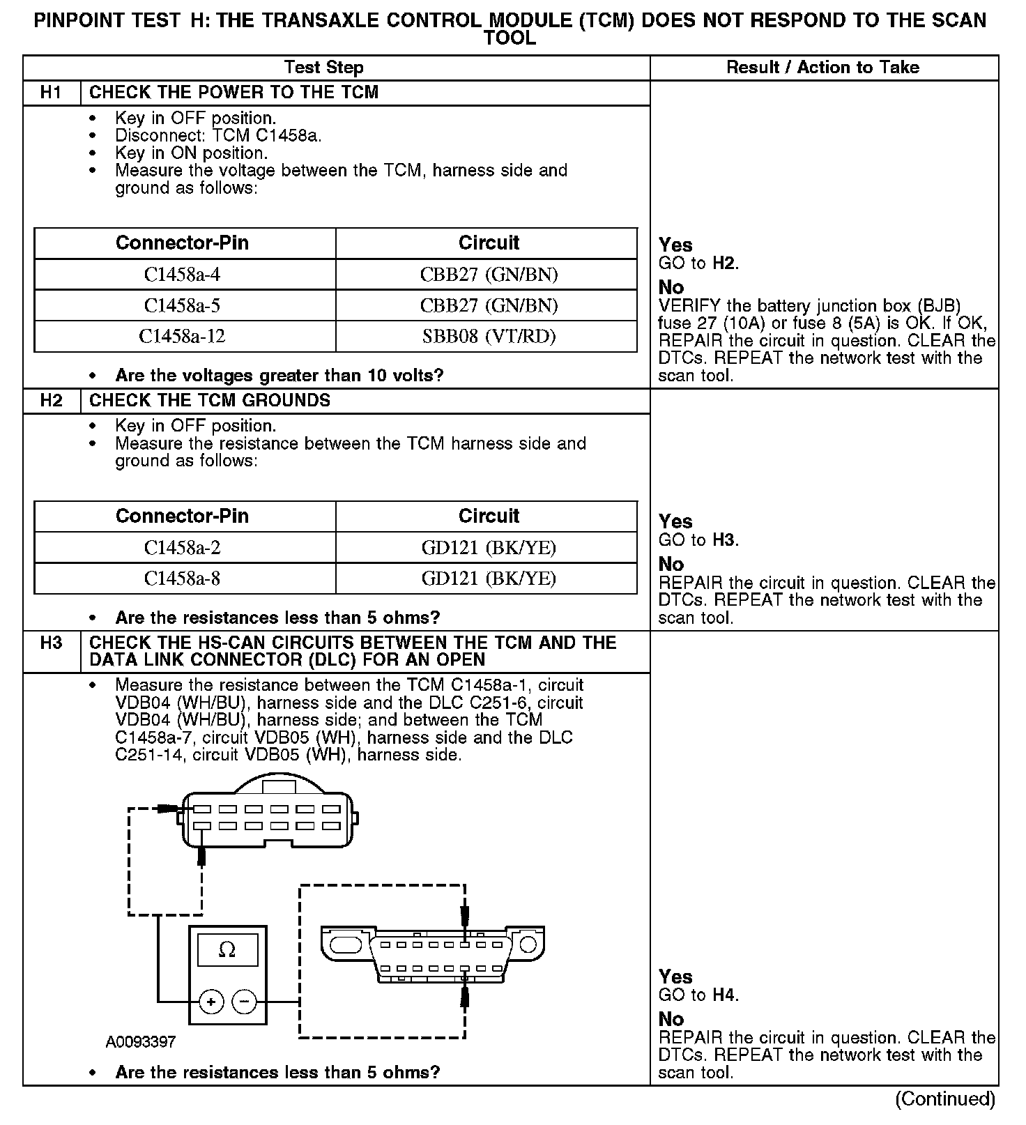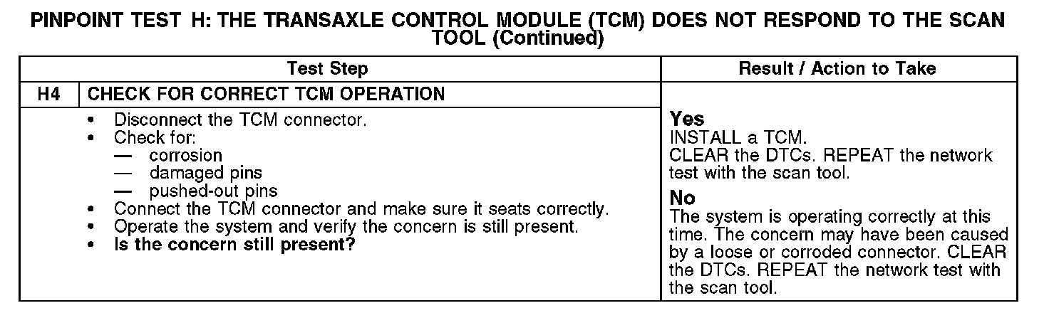 Home >> Ford >> 2008 >> Escape 2WD V6-3.0L >> Repair and Diagnosis >> Powertrain Management >> Computers and Control Systems >> Information Bus >> Testing and Inspection >> Pinpoint Tests >> Test H: The Transmission Control Module (TCM) Does Not Respond To The Scan Tool