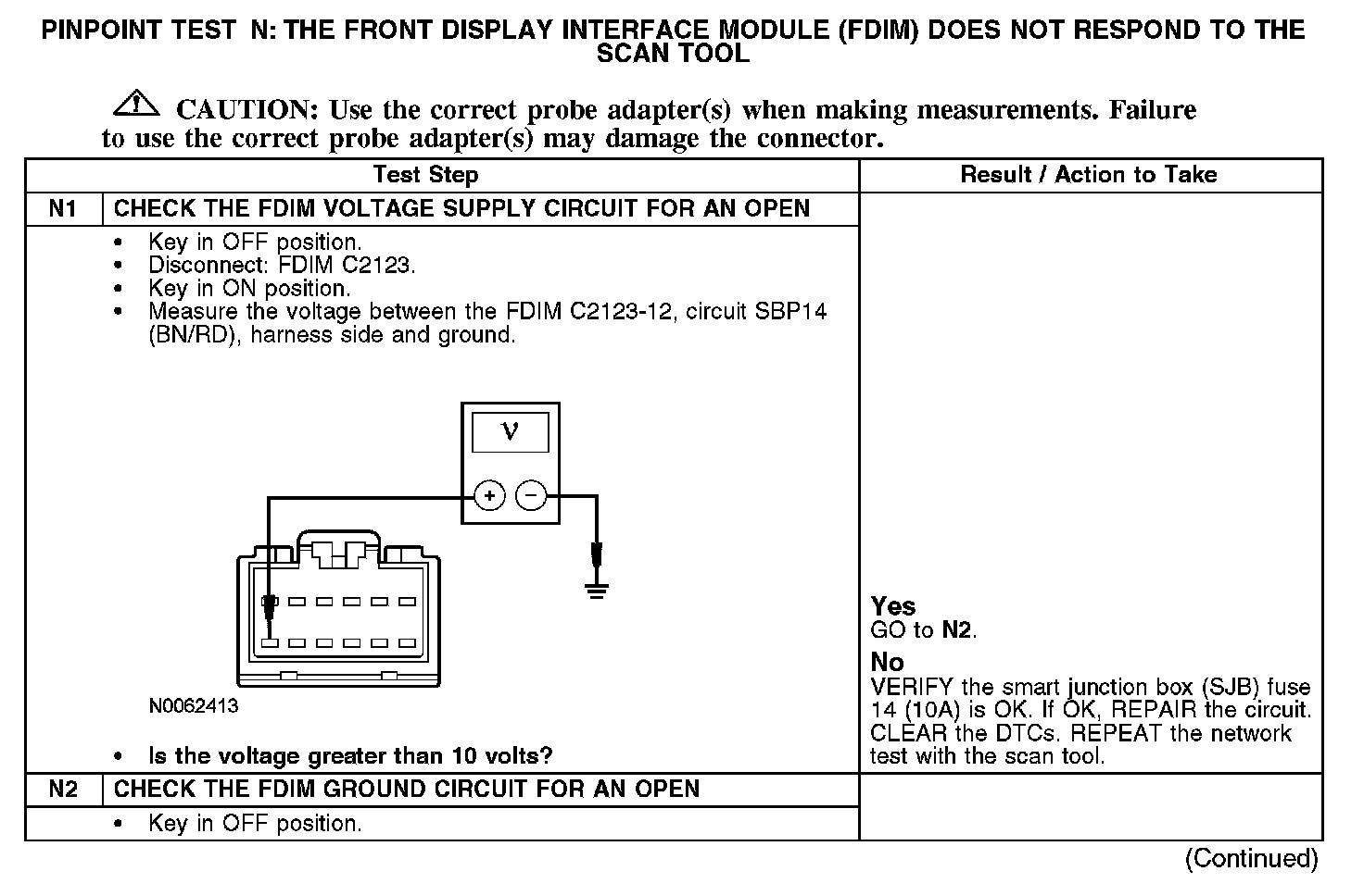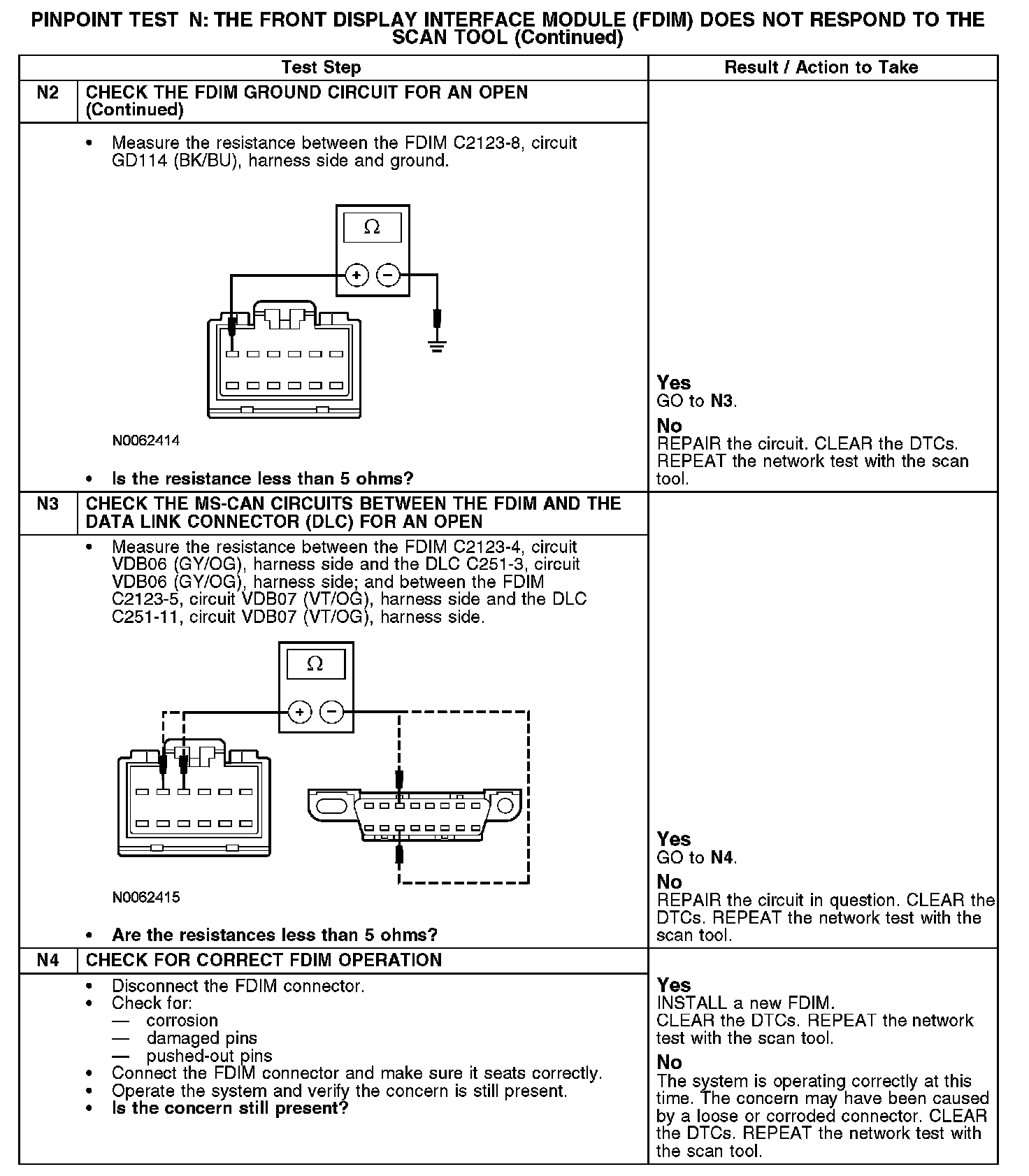 Home >> Ford >> 2008 >> Escape 2WD V6-3.0L >> Repair and Diagnosis >> Powertrain Management >> Computers and Control Systems >> Information Bus >> Testing and Inspection >> Pinpoint Tests >> Test N: The Front Display Interface Module (FDIM) Does Not Respond To The Scan Tool