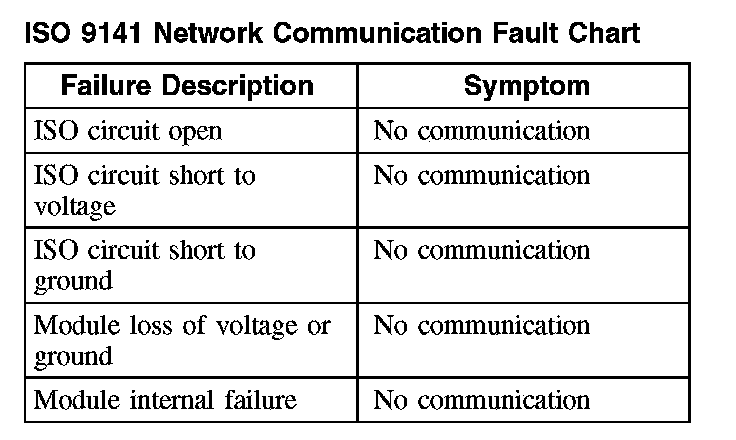 The following fault chart describes the specific ISO 9141 network failures and their resulting symptom: