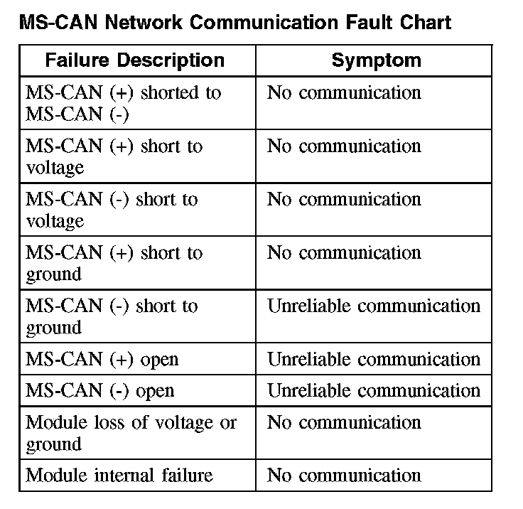 The following fault chart describes the specific MS-CAN network failures and their resulting symptom: