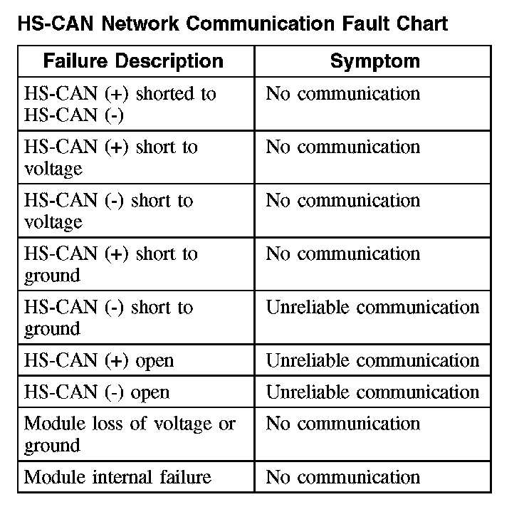 The following fault chart describes the specific HS-CAN network failures and their resulting symptom: