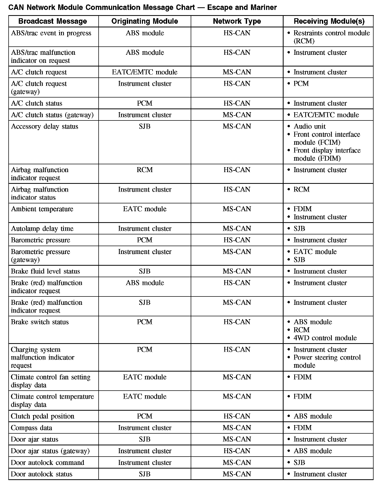 CAN Network Module Communication Message Chart - Escape and Mariner (Part 1):