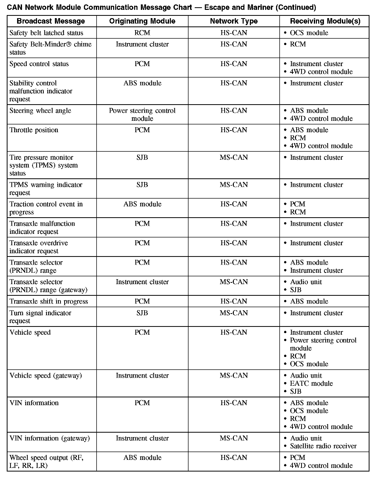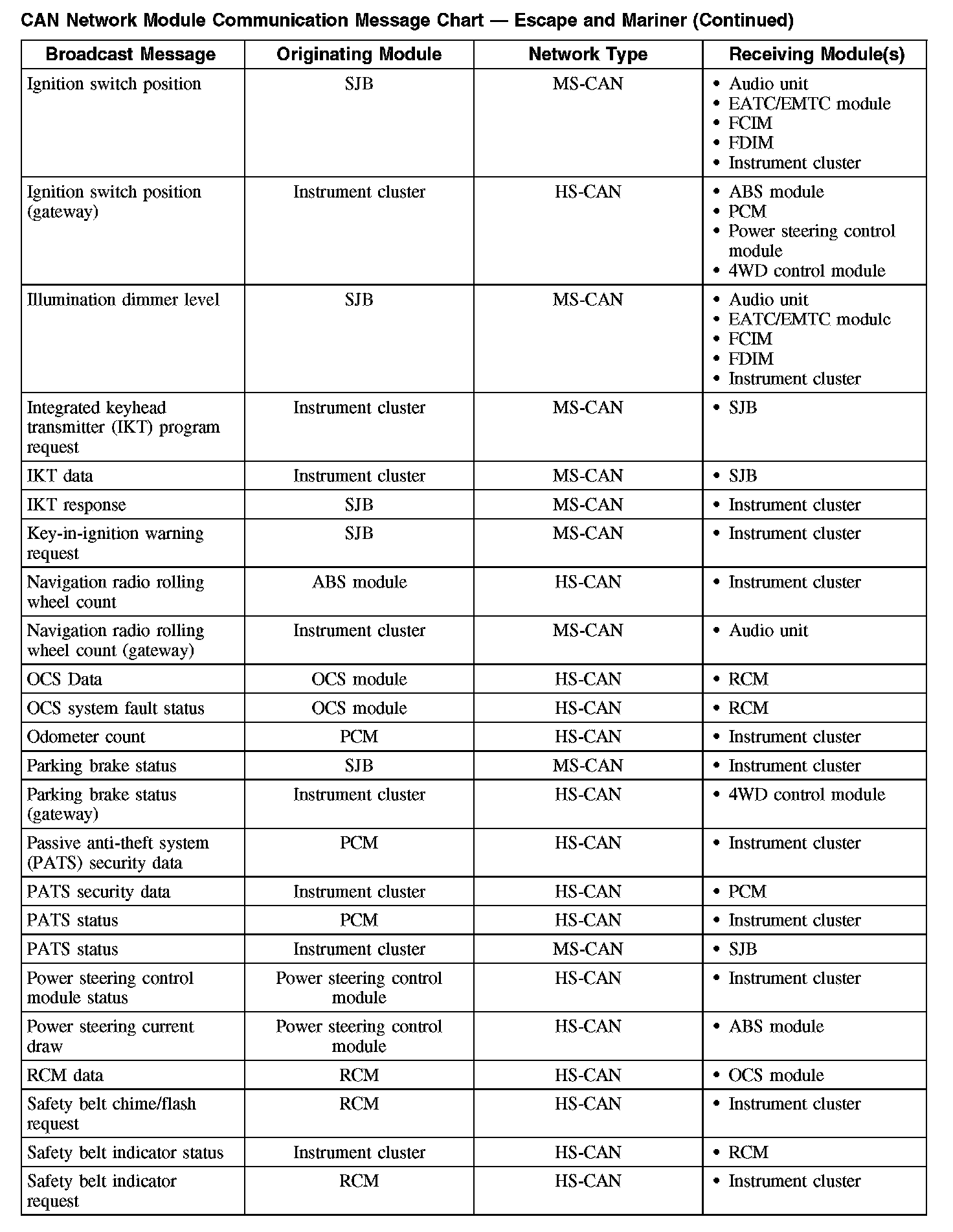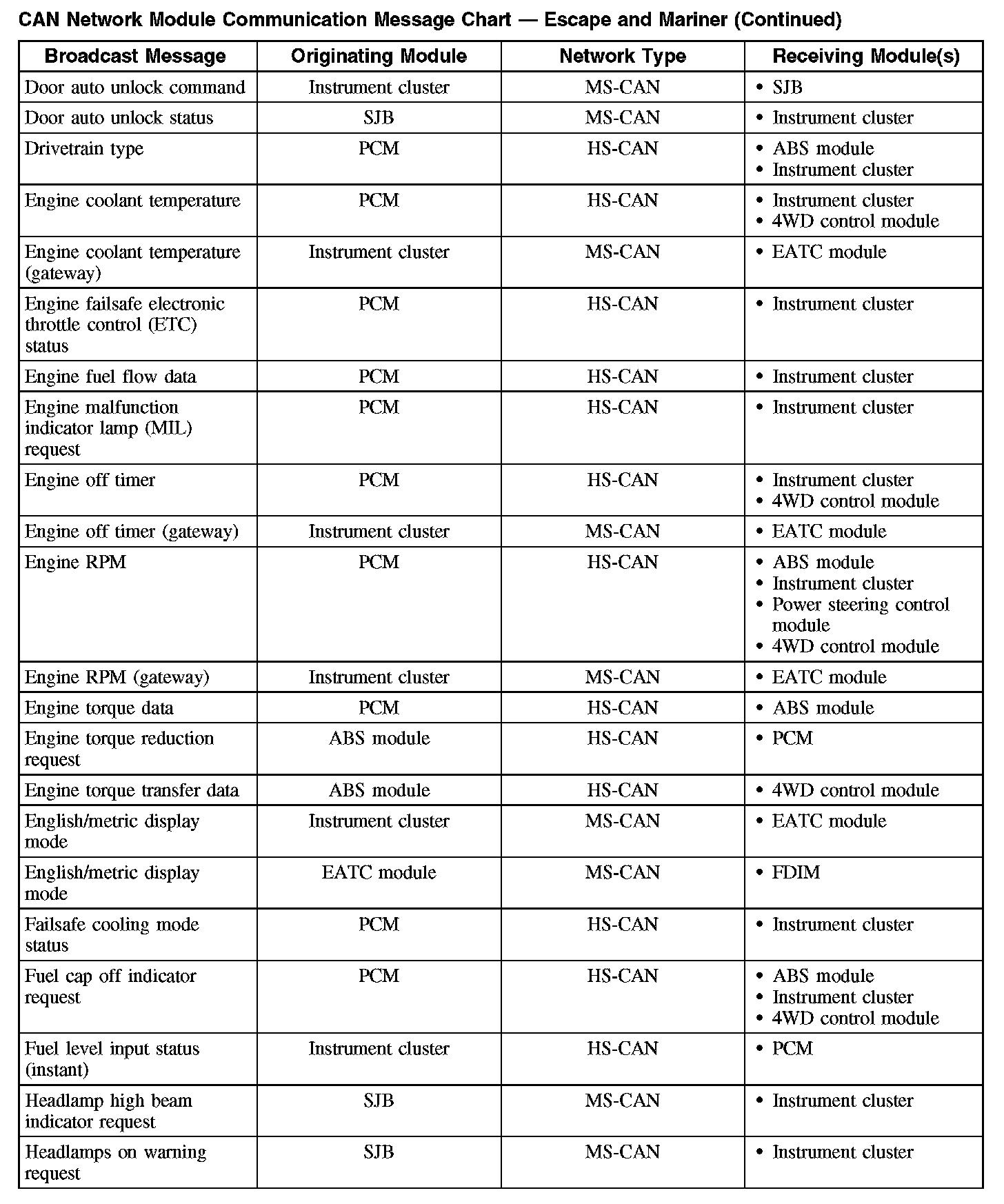 CAN Network Module Communication Message Chart - Escape and Mariner (Part 4):