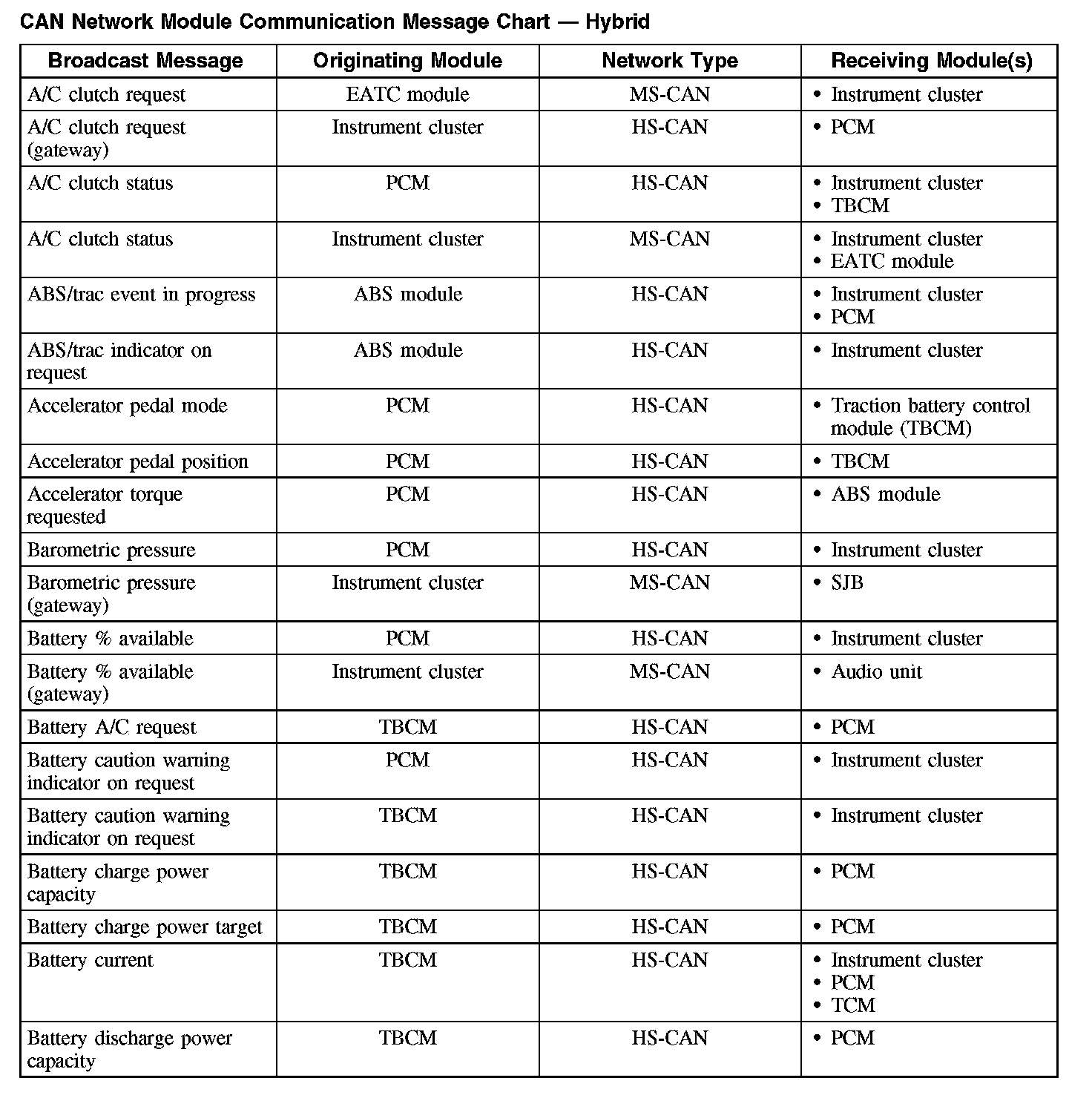 CAN Network Module Communication Message Chart - Hybrid (Part 1):