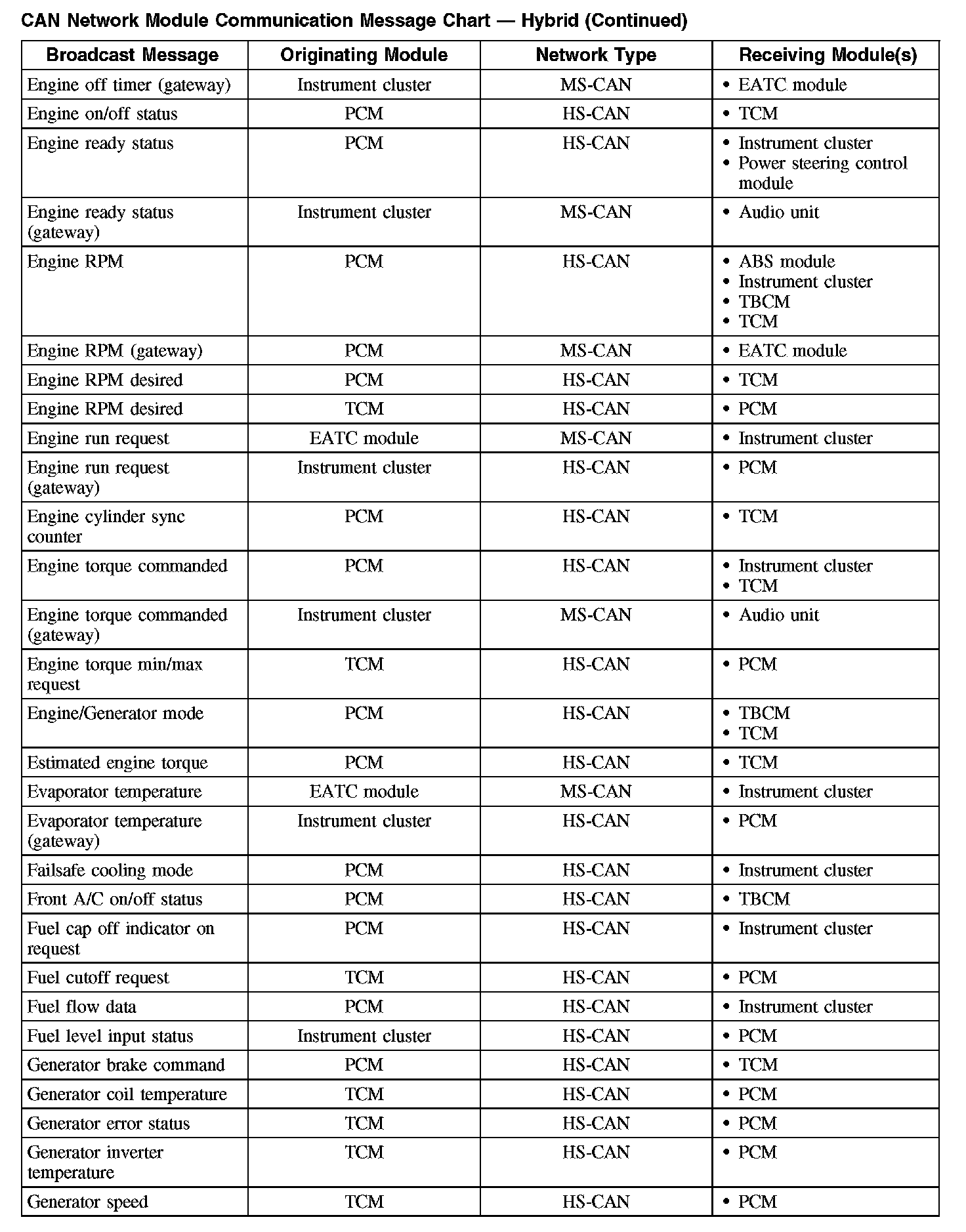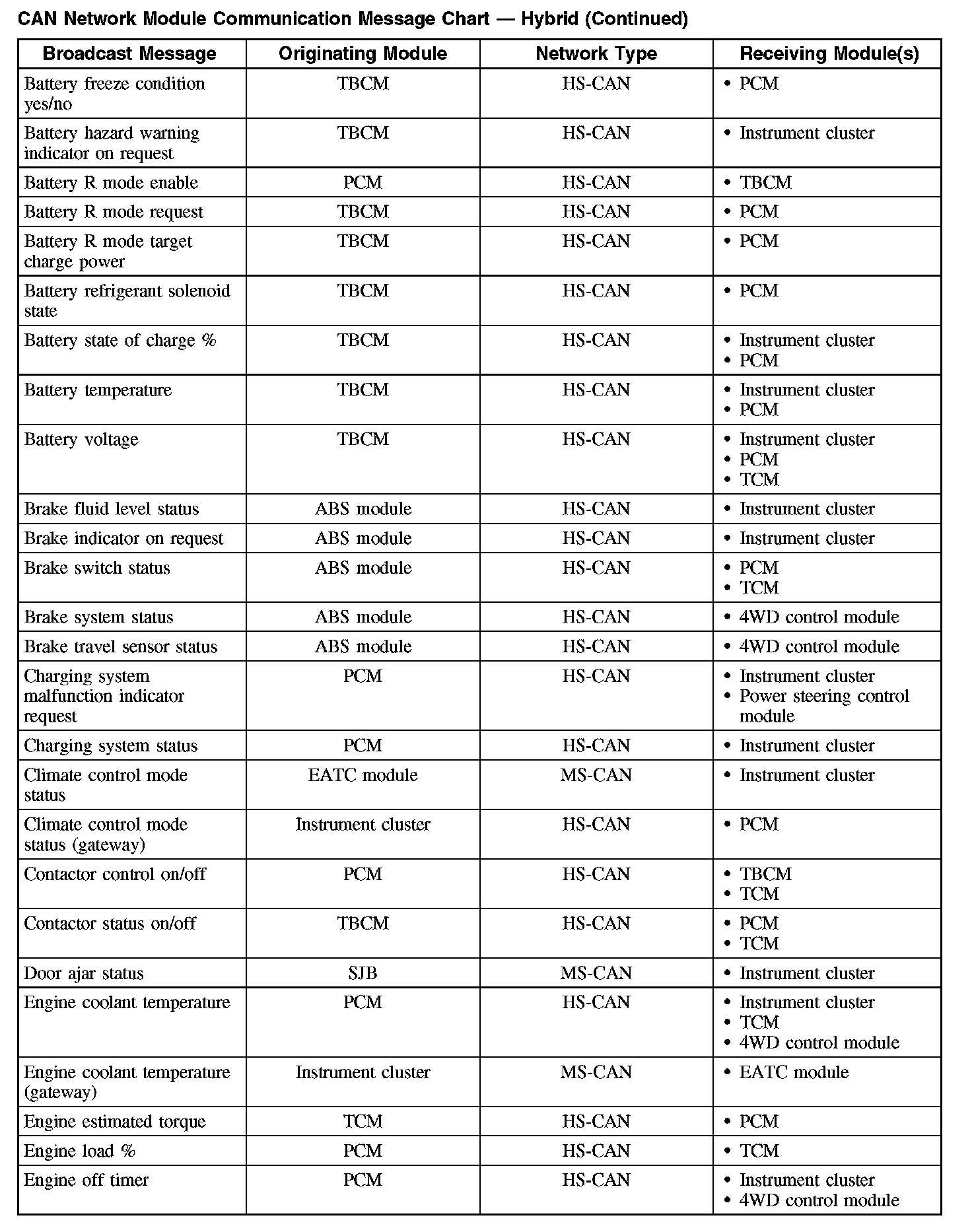 CAN Network Module Communication Message Chart - Hybrid (Part 2):