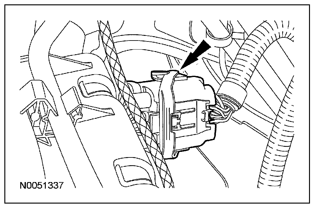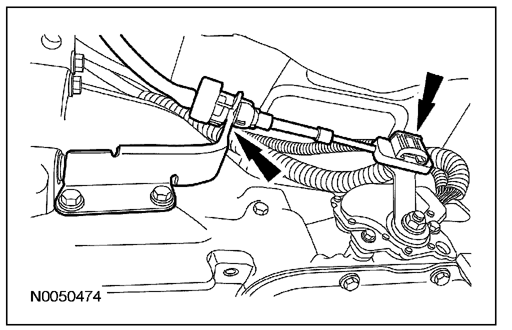 59. Disconnect the transmission electrical connector from the harness and the clip on the A/C line.
