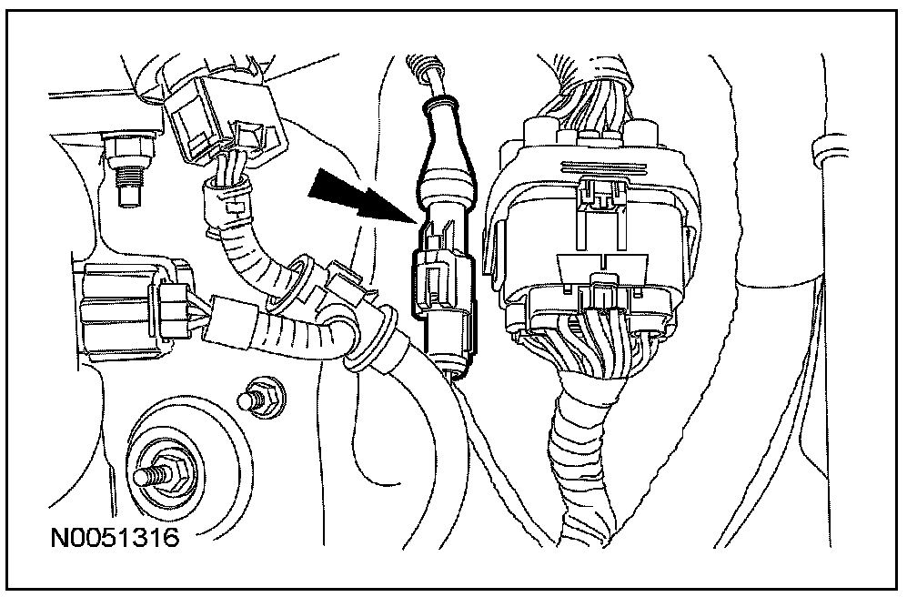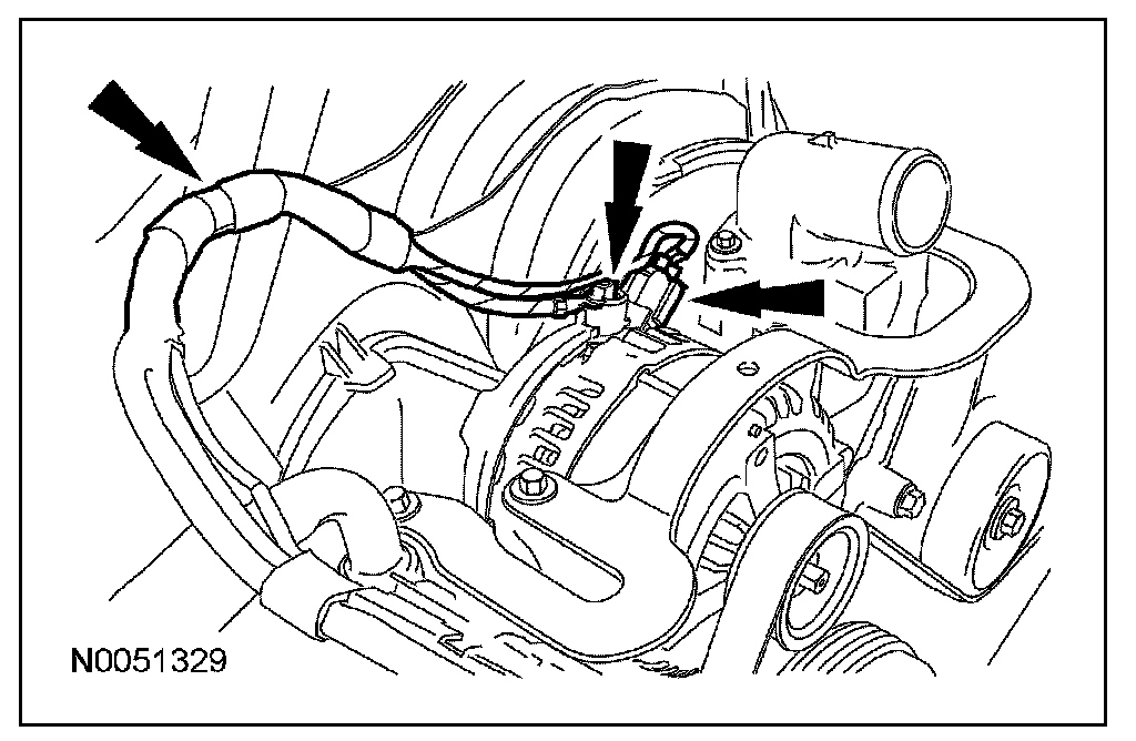 51. Remove the nut and disconnect the electrical connector from the generator wiring harness and remove from the retainer.
