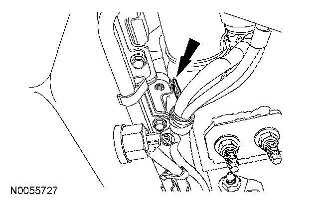 8. Remove the transmission cooler tube support bracket nut and detach the battery cable bracket and transmission cooler line bracket from the front cover stud.