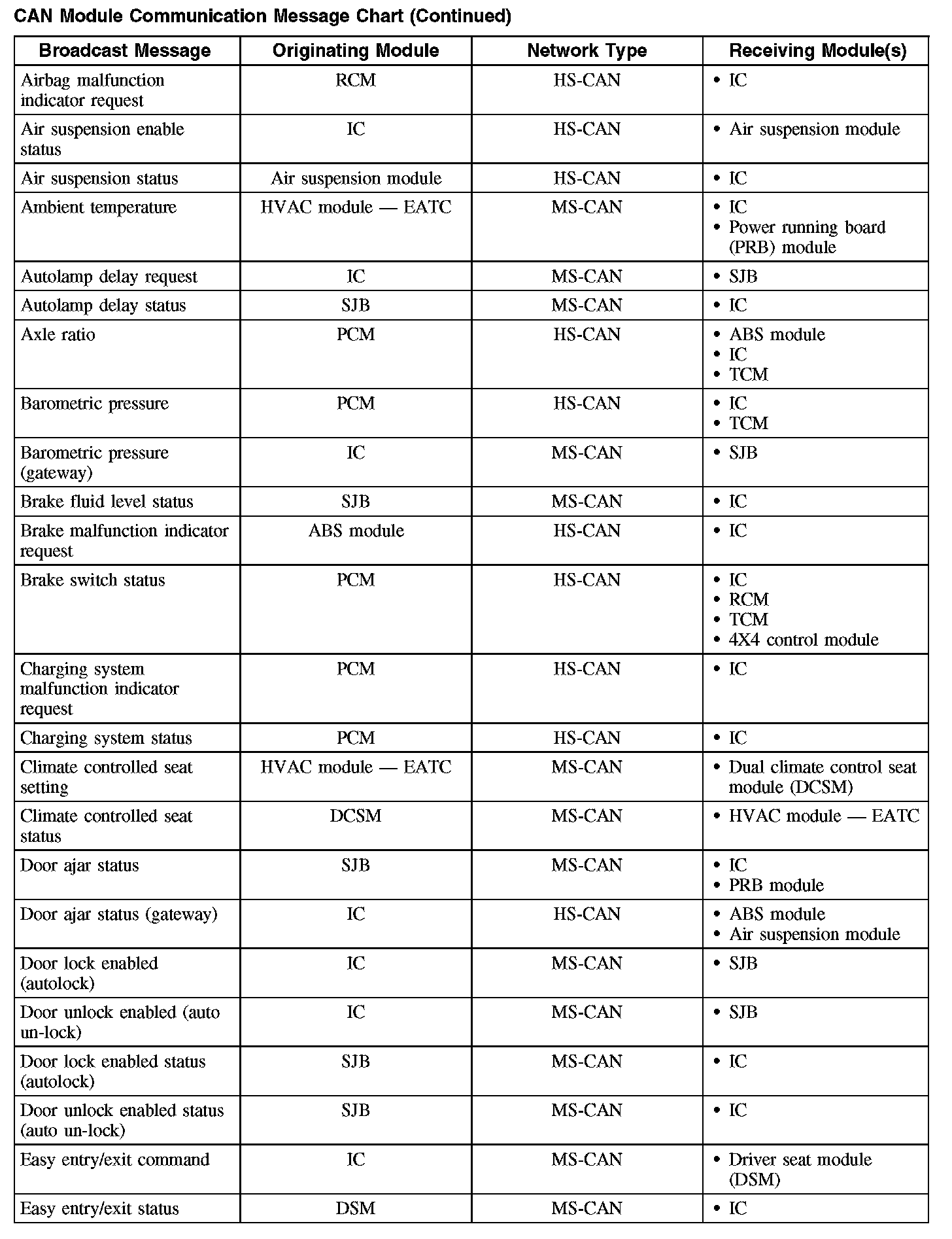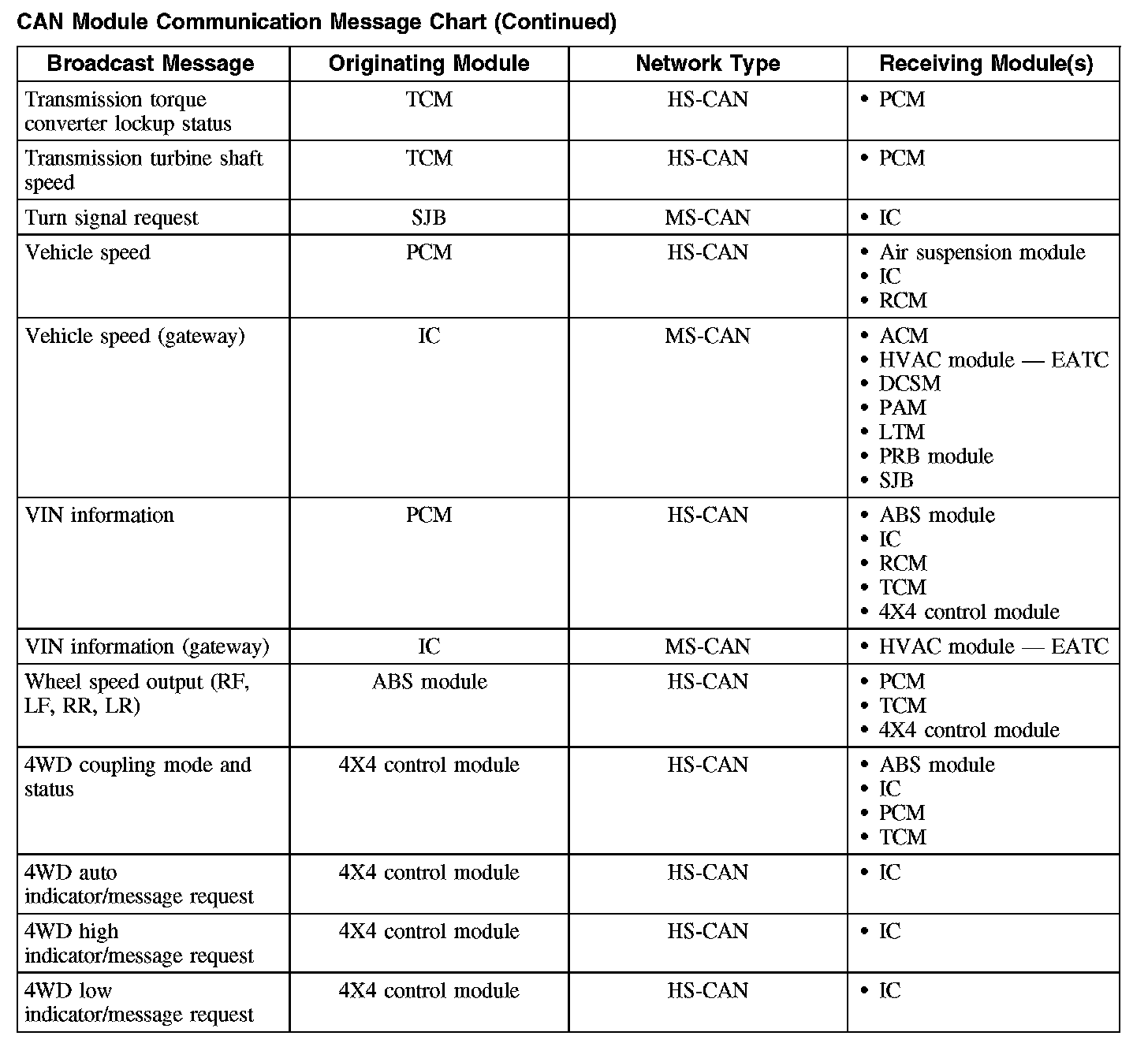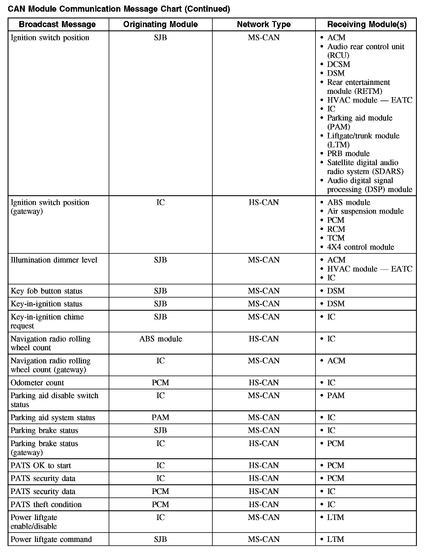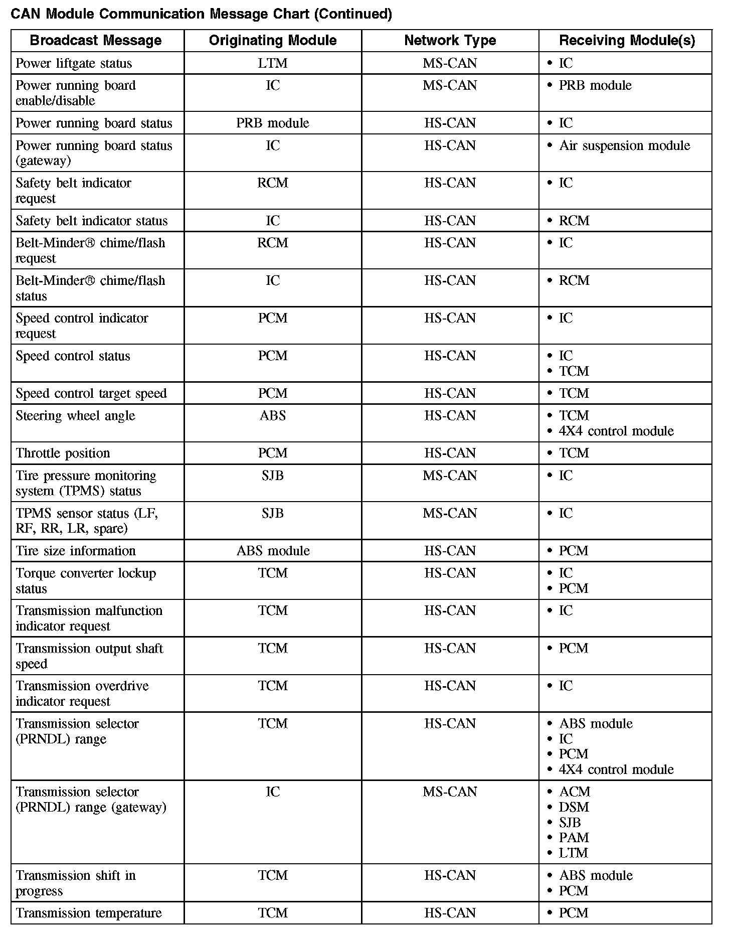 The following chart describes the specific CAN messages broadcast by each module, and the module(s) that receive the message: