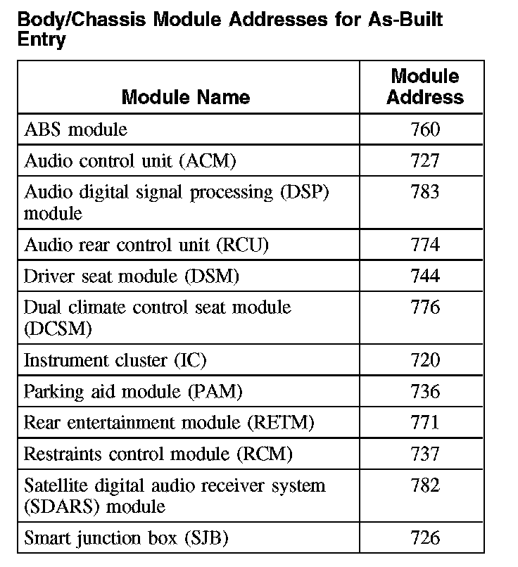 As-Built data is a VIN specific module configuration record. During vehicle build, the configuration from all modules is downloaded and stored in the As-Built database. As Built data will not reflect customer preference items that have been changed from the default state. These items will need to be changed using programmable parameters after the module is configured.