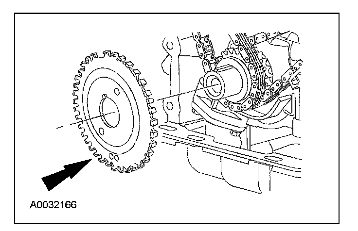 14. CAUTION: Damage to the variable camshaft timing (VCT) phaser sprocket assembly will occur if mishandled or used as a lifting or leveraging device.