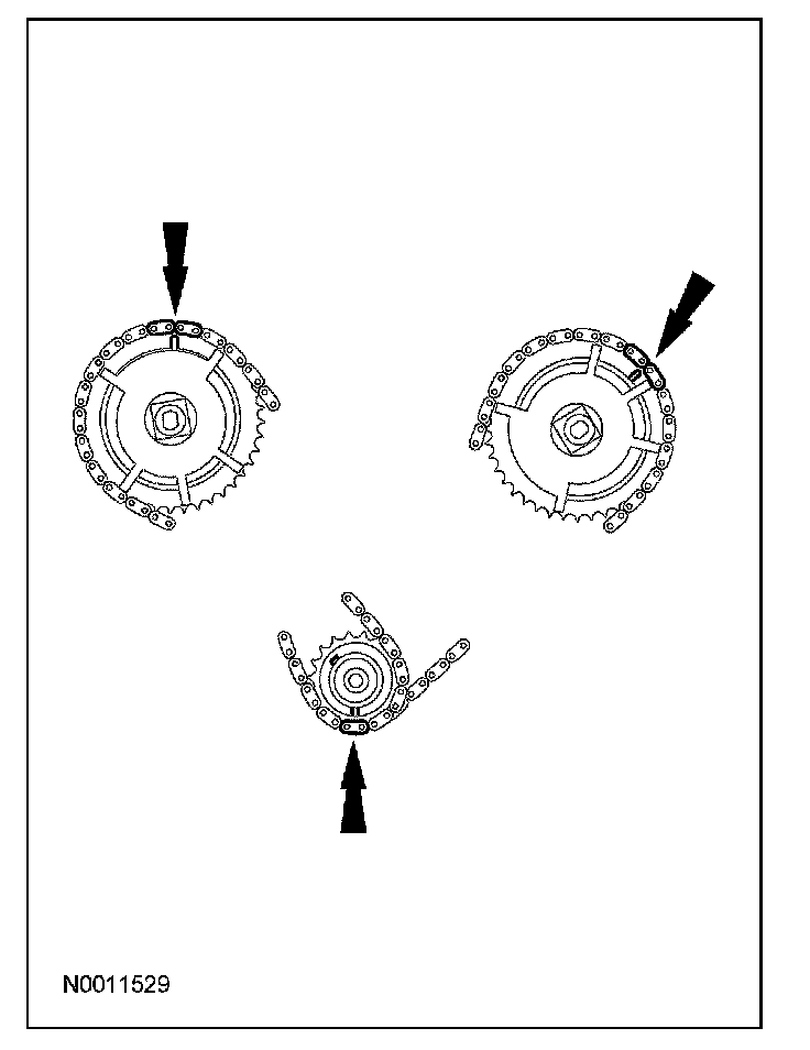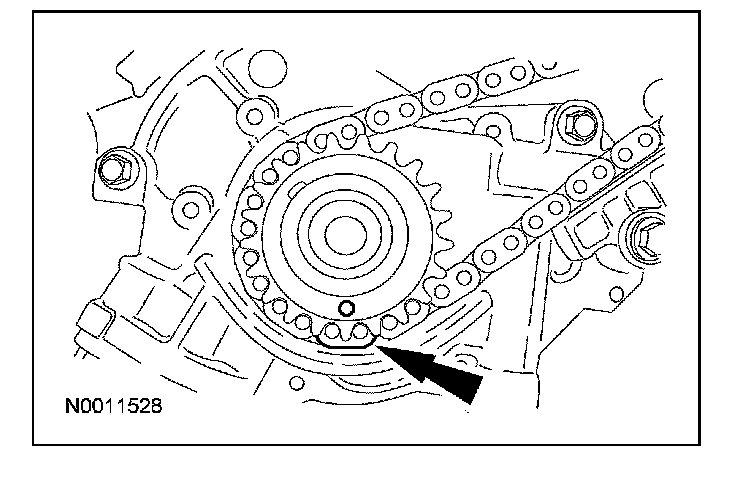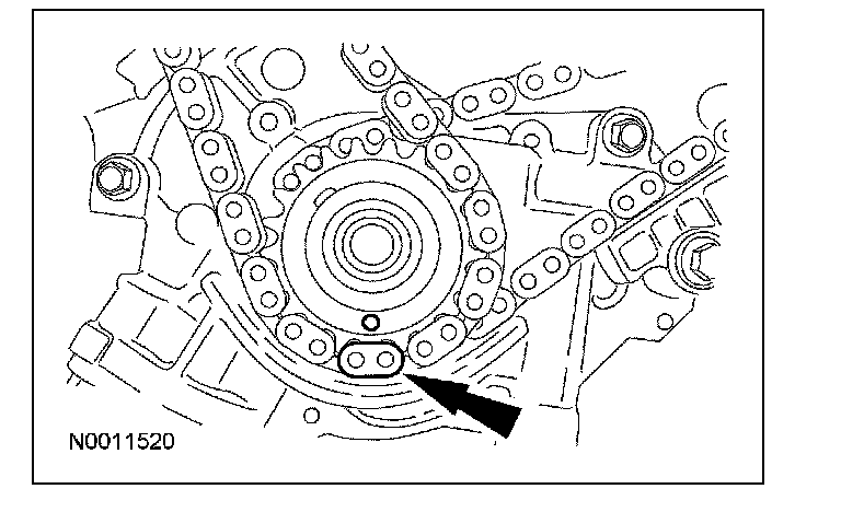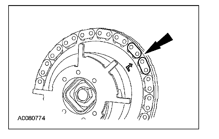 Position the RH timing chain on the VCT phaser sprocket with the timing mark positioned between the 2 copper (marked) chain links.