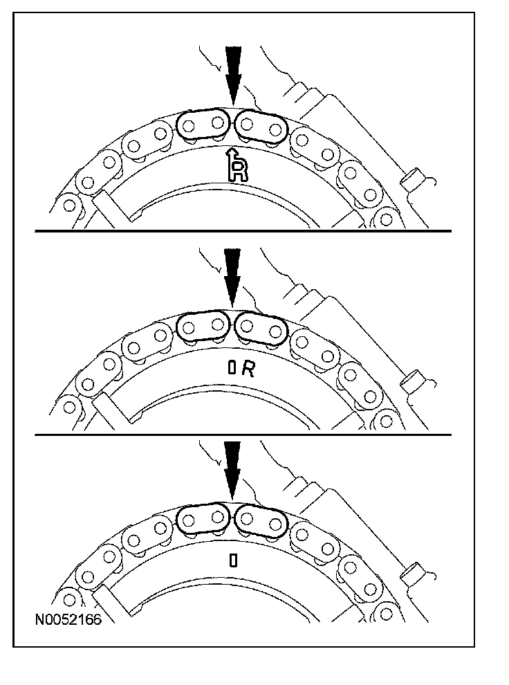 16. Position the lower end of the RH (outer) timing chain on the crankshaft sprocket, aligning the timing mark on the sprocket with the single copper (marked) chain link.